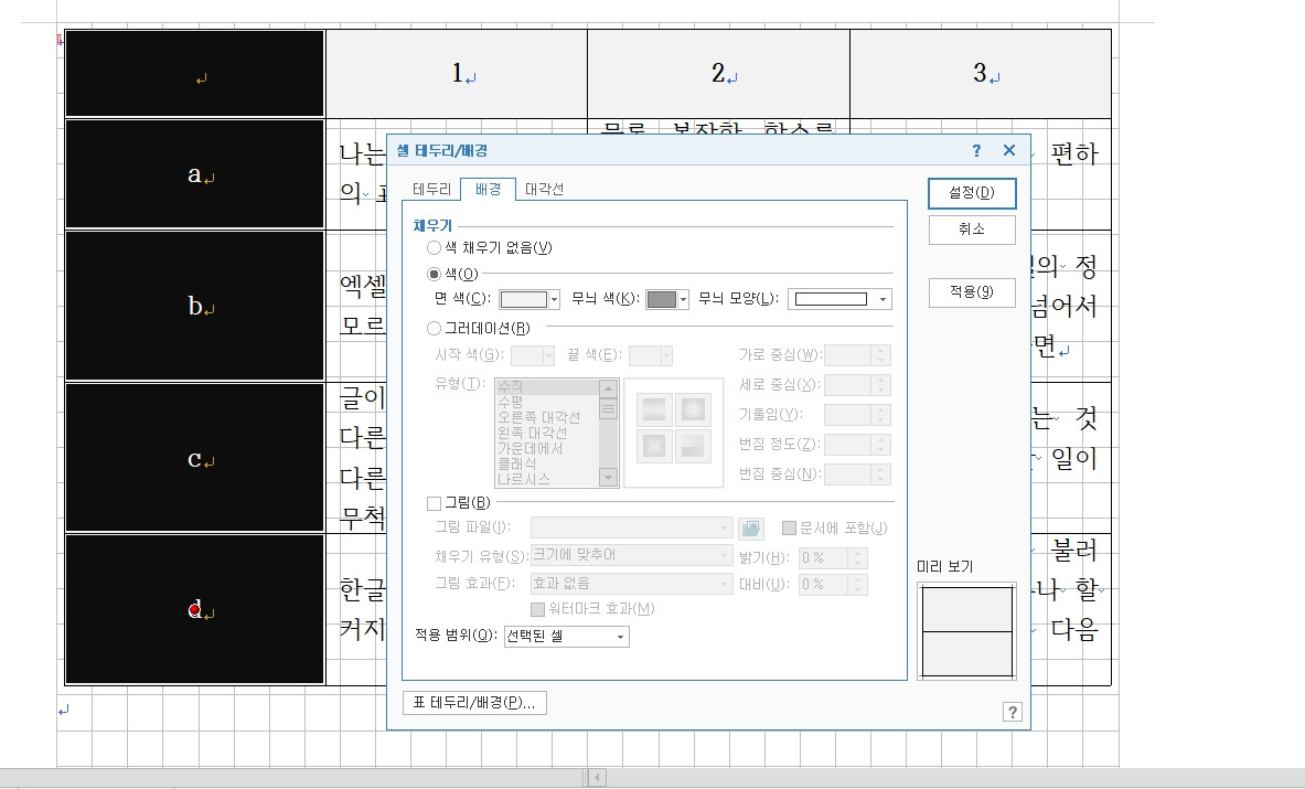 F5를 누르고 원하는 만큼 셀을 지정하면, 스타일을 먹이듯이 폰트 종류와 크기, 정렬 상태 등을 설정할 수 있다. 예컨대, [가운데정렬]을 설정하면 텍스트가 가운데로 몰리는데, 텍스트가 짧으면 예뻐 보이지만, 텍스트가 길면 지저분해 보인다. 숫자는 [가운데정렬]이 좋다. 대체로 표의 맨 왼쪽의 번호 칸과 맨 위쪽 메뉴 칸은 [가운데정렬]이 좋아 보이고, 글씨를 진하게 하거나 셀에 색을 넣으면 눈에 더 잘 들어온다. 셀에 색을 어떻게 넣냐고? F5로 원하는 만큼 셀을 지정하고, 단축키 [L](마우스 우클릭- [셀 테두리/배경])을 누르면 테두리와 배경을 선택할 수 있다. [테두리]에서는 원하는 선을 진하게 하거나 안 보이게 할 수 있고, [배경]에서 색을 넣을 수 있으며, [대각선]에서 대각선도 넣을 수 있다.