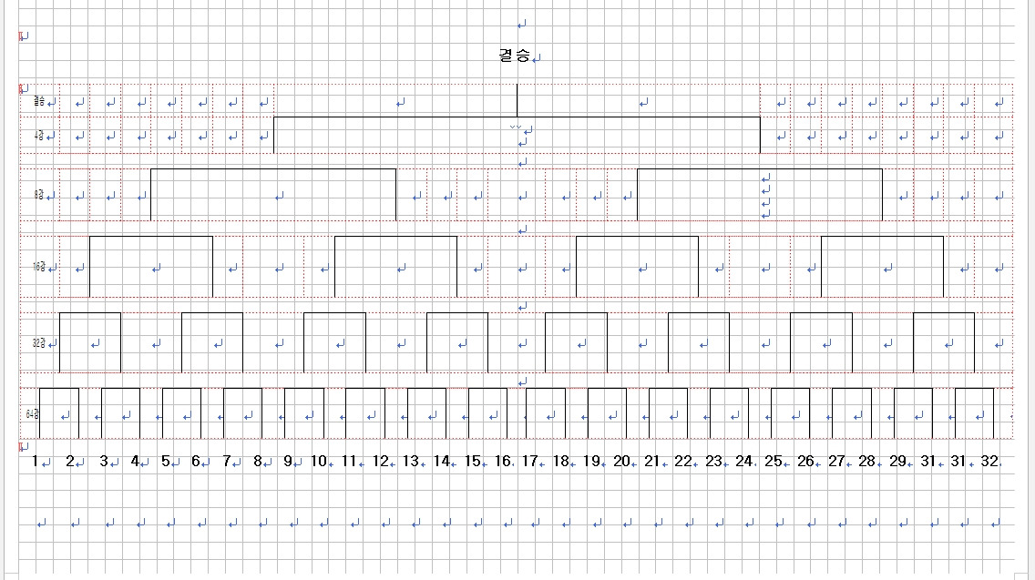 여기서 F5에 관한 아픈 추억을 잠깐 언급하겠다. 그것도 군대 이야기! 두둥!! 당연히 군대에서 축구 찬 이야기는 아니다.(뭐 크게 다르지 않겠지만...) 실은, F5로 표 만들기는 군대에서 배웠다. 전방 GOP(북한군을 마주 보지 않은 곳은 군대가 아니지!)에 올라갔다 내려오면서 중대본부 교육계로 착출 당한 나는 말년을 누리지 못하고, 야근야근했다 젠장. (동기 뿐만 아니라 후임까지 손 까닥 안 해도 되는 대장놀이하고 있었는데 말이다ㅠㅠ) 거기서 나는 한글의 여러 기능들을 터득할 수 있었는데, 그 당시 군대에서 합법적으로 쓸 수 있는 프로그램은 한글뿐이었다. 그런데, 그런데, 한글로 정말 별것을 다 만들어냈다! 공문 서류부터 시작해 팻말, 일과표, 식단표, 심지어 훈련 작전 지도까지! 32강 토너먼트 표는 껌! 지금 생각해보면 미친 짓이었으나, 정말 만들어냈다!