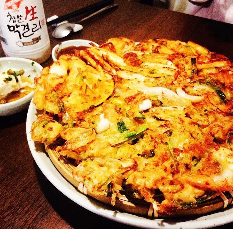 오징어와 새우 그리고 파가 촘촘히 박힌 해물파전 (feat. 막걸리)