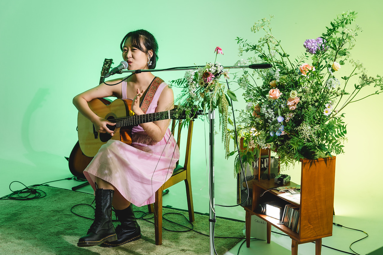6월 30일 '플롭 페스티벌'은 '여름'과 '뮤지션의 방'이라는 주제로 기획되었다. 관객들에게 내가 느끼는 여름의 이미지를 전하고 싶어 바캉스에서 입을 것 같은 옷을 찾았다. 먼저 핑크색 원피스를 골랐다. 내 얼굴에 핑크는 딱 붙는 색이 아니라 조금 고민했지만, 공연장인 올레아다 스튜디오가 평소엔 사진스튜디오로 활용되는 곳이라 조명이 받쳐줄거라는 생각이 들었다. 민소매로 상체가 휑해보여서 거대한 귀걸이, 록커의 마지막 자존심으로 워커를 신어 마무리. 공연에 맞게 잘 골랐고 꽤 어울려서 속으로 '오늘 나 좀 귀엽구만' 생각했더랬다.