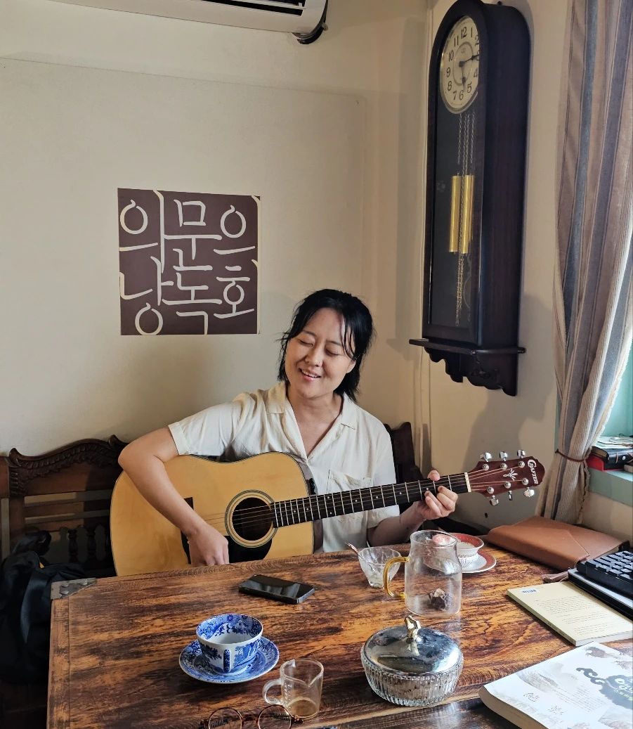 시인님을 처음 뵈었을때 내 노래를 들려드리고 싶다고 생각했다. 좋아해주실 것 같다는 느낌이 들었다. 바로 앞에서 노래하려니 떨려서 눈을 꼭 감고 기타를 쳤다. '떨리는 이 모습 그대로 보여드릴게요.' 하는 마음으로. 스텔라가 찍어준 사진 속 내 모습이 정말 예뻤다. 화려한 옷이나 화장은 없었지만 마음을 담아 집중하는 모습이 보였다. 이런 에너지야말로 내가 사람들에게 줄 수 있는 가장 좋은 것이라는 생각이 들었다. 건강한 마음과 신체를 유지하기 위해 열심히 운동하고, 골고루 먹고 잘 살아야겠다는 생각이 들었다.