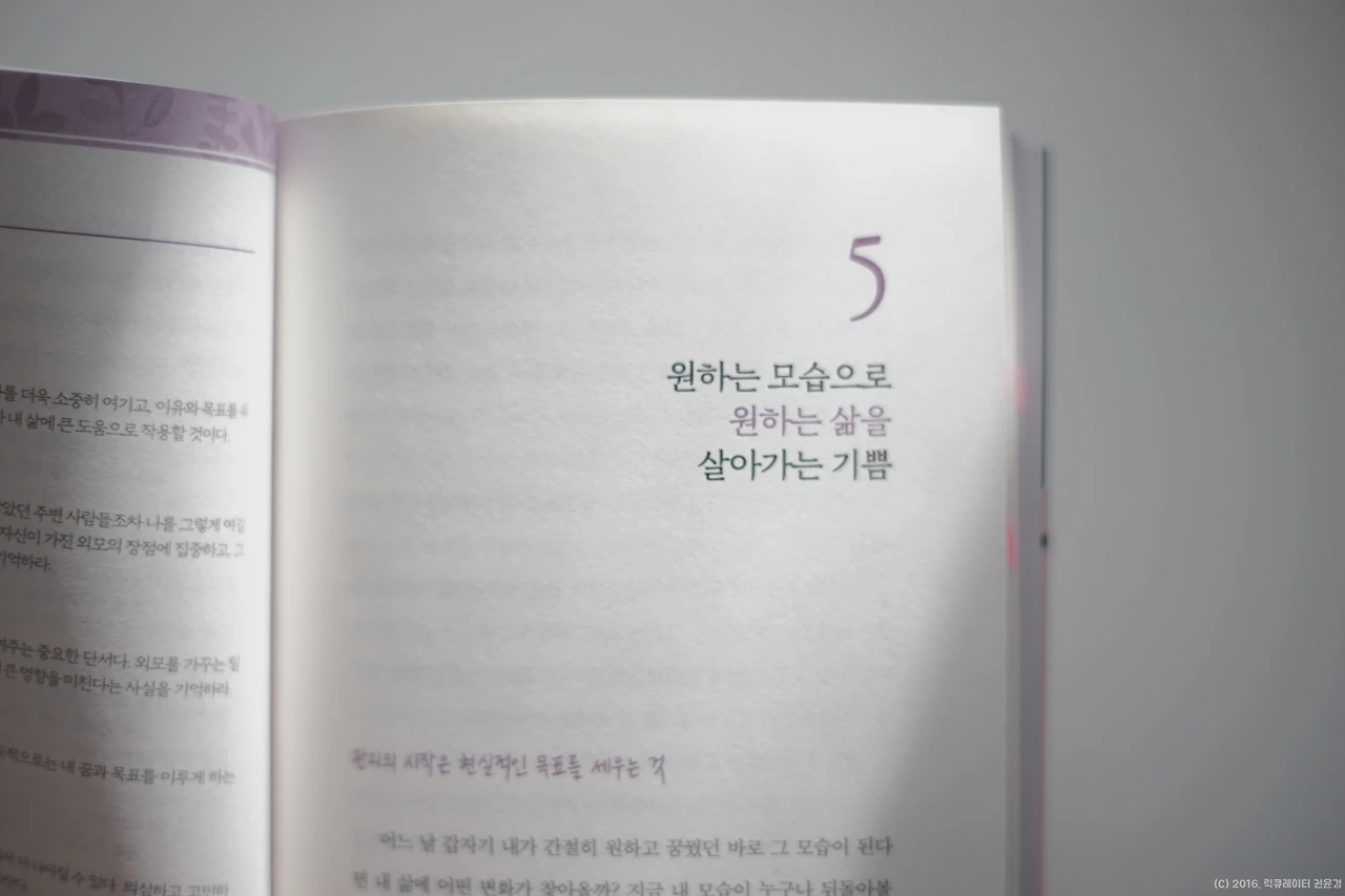 (p.8) 내가 진행하는 이미지 컨설팅은 여타의 강의와 다른 점이 있는데, 바로 스킬을 익히기 전에 '마인드 트레이닝'을 진행한다는 것이다. 한 사람이 가지고 있는 내면은 눈으로 보이는 실제 모습을 만들어낸다. 예쁘게 화장을 하고 옷을 입기 전에, 먼저 자신을 바라보는 편협하고 왜곡된 시선을 바로잡아야 한다. 그 다음 단계로 스스로 매일 외모를 관리하고 변화시킬 수 있는 간단한 방법들을 소개한다. 심리학에서 말하는 '인지행동요법'을 이미지 컨설팅에 접목해 사고의 프레임을 전환하고, 내면과 외면의 변화가 자연스럽게 이루어지도록 한다. 실제로 나를 만났던 많은 여성들은 내면을 변화시키고 외모를 가꾸는 습관을 익히면서 매일매일 눈에 띄게 밝아졌다. 마음이 외치는 목소리에 귀 기울이고 진정으로 원하는 이미지를 찾아 꿈에 한걸음 다가가는 쾌거를 이루기도 했다.