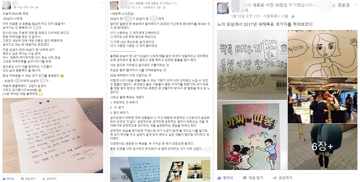 노아, 열여덟번째 모임은 '스무살의 나에게'. 이제 갓 스무살이 된 이부터 스무살의 기억이 가물가물한 이까지, 나이도 성별도 하는 일도 성격도 제각각인 사람들. 칼바람이 부는 날씨에도 따뜻한 가슴을 안고 모였-다기보다는 방에 난방을 너무 빵빵하게 틀어줬-기에 훈훈한 시간을 나눌 수 있었다. 히데오 할아버지의 영상 편지를 다같이 보고 각자 스무살의 자신에게 편지를 쓴다, 그 내용을 일부 공유한다, 그리고 올해의 목표를 딱 세 가지씩 정해서 이야기 나눈다는 단순한 프로그램이지만 함께 하다보면 색색깔의 생각들이 머릿속을 가득 채운다. 이미 우리 마음속에는 봄이 온 것 같았다.