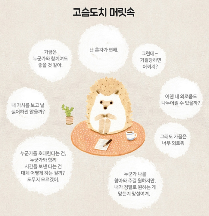 서점을 서성이다 한 문구를 지나쳤다. 한 발 두 발 뒷걸음으로 돌아와 가만히 그 문구를 바라본다. "나한텐 아무도 안 와. 근데... 나도 안 가, 아무한테도." 의자에 동그마니 앉아 있는 고슴도치 한 마리. 그는 숲 속 동물친구들을 집에 초대하며 이런 편지를 쓰는 성격이다.