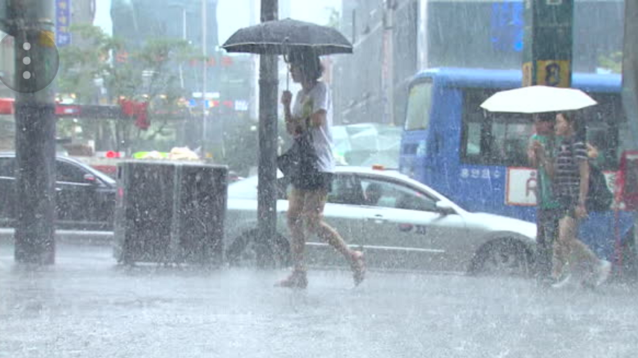 천변에서 장애자용 전동휠체어가 불어난 물살에