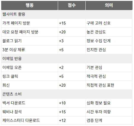 웹사이트 방문, 콘텐츠 다운로드, 이메일 반응 등