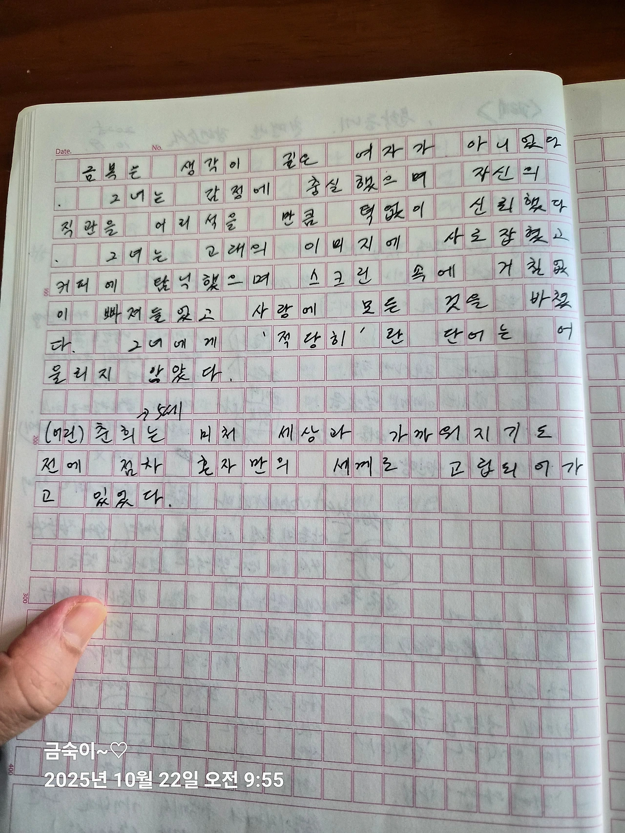 나는 춘희의 삶이 가련하면서도 끌렸다. 다른 이와 다르게 태어나 고통받았지만, 외부의 고통은 춘희를 진정 괴롭히지 못했다. 그녀의 괴로움은 모두 그녀가 자신 안에서 만들어낸 것만이 진짜 고통이었다.