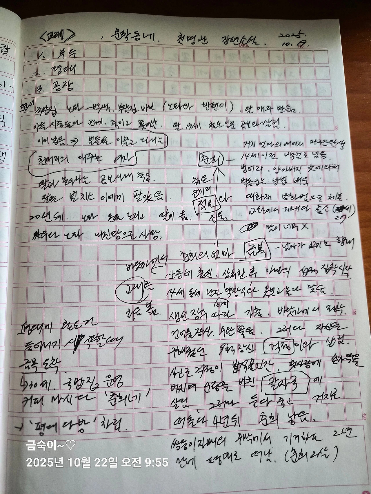 노트를 펴서 오래간만에 줄거리를 정리했다. 사실 수업 교안을 한참 만들 때는 읽은 책 모두를 이렇게 정리해서 교제로 쓸 수 있게 1차 정리했었는데, 요새는 학생들과 대화를 하며 책을 읽은 감상을 정리하는 경우가 많아 잘 쓰지 않았다.