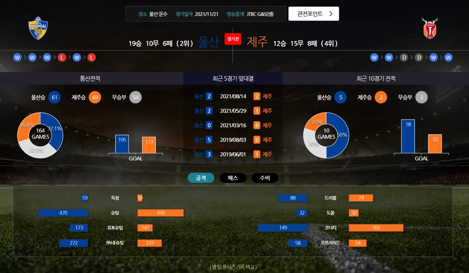 - 스플릿(파이널라운드 전적) 3승 1무 제주 우세