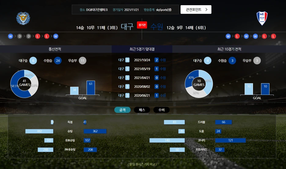 - 대구DGB파크 전적 2승 1무 2패 동률