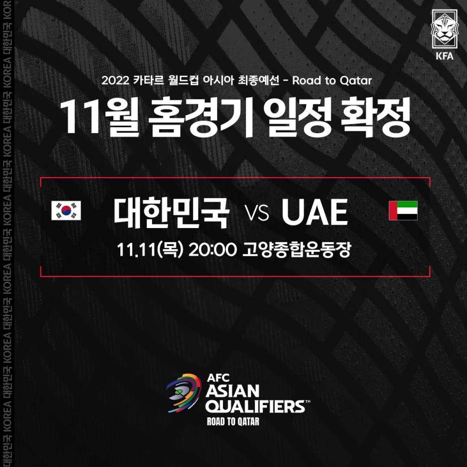 남자대표팀은 11.11 -11.16일에 카타르 월드컵 아시아 예선 5,6차전을 치릅니다. 그리고 5차전은 홈에서 UAE를 만나는데요, 오늘 장소일정이 공개 되었습니다. 고양종합운동장입니다.