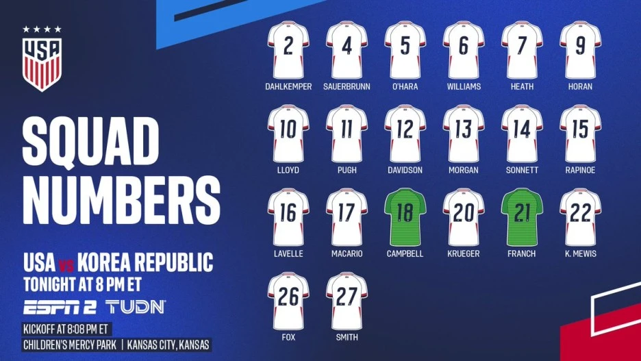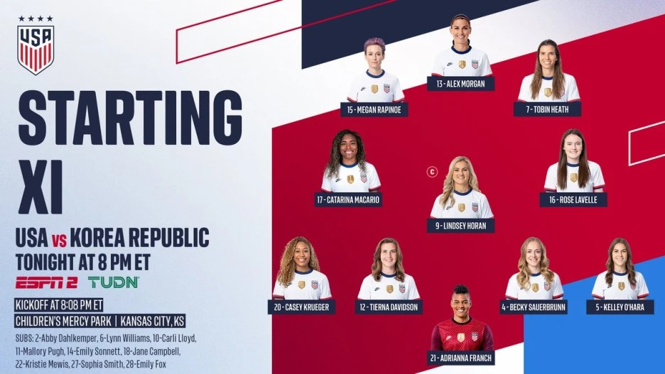 미국대표팀은 라피노와 모건 선수를 필두로 4-3-3 포메이션을 정했습니다. 미국의 중앙미드필더 린지 호란 선수는 100번째 A매치를 맞아 주장 완장을 받았습니다. 미국 대표팀에서 41번째 센추리 클럽을 기록했습니다..