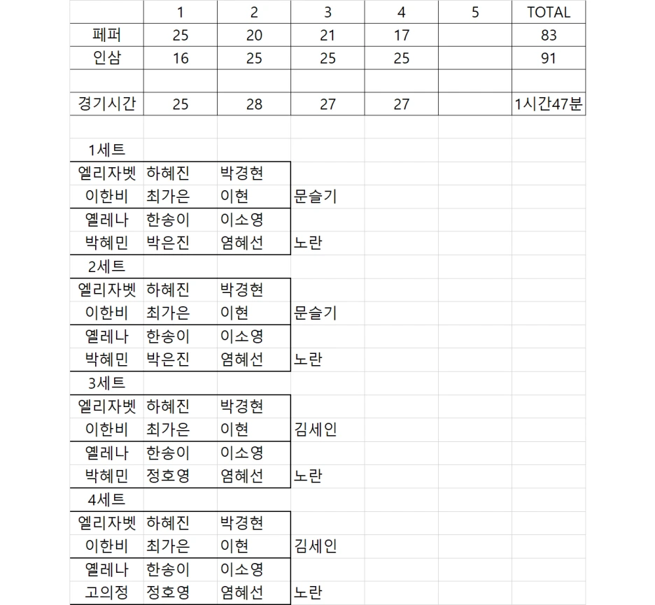페퍼스는 엘리자벳이 19득점으로 분전했지만 최고의 팀을 이기기에는 역부족이었습니다. 이한비 선수가 수비에서 빛이 났지만 전체적인 리시브 효율이 두배정도 차이가 나고(페퍼스 23%, GS46%) 그것은 세팅 성공률의 저하와 공격 성공률의 저하를 불러 일으켰습니다. 김형실 감독 말대로 선수들의 구력이 짧기에 젊은 패기를 보여주는 것 만으로도 좋은 활약이라고 생각합니다. 페퍼스는 언제나 응원합니다.