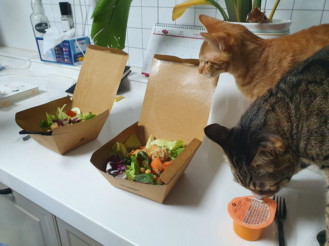 오랜만에 든든히 먹어줬으니 저녁까지는 약발이 갈 줄 알았다. 하지만 원고를 완성한 오후 5시쯤 되자 배고픔이 미친 듯이 몰려왔다. 입에서는 똥내가 나는 것 같았다. 애꿏은 물을 들이키다가 구세주의 도움으로 견과류 한 봉지를 손에 넣을 수 있었다. 방송을 무사히 마치고 저녁엔 구성이 알찬 연어샐러드를 사다 먹었더니 이제 정신이 돌아왔다.