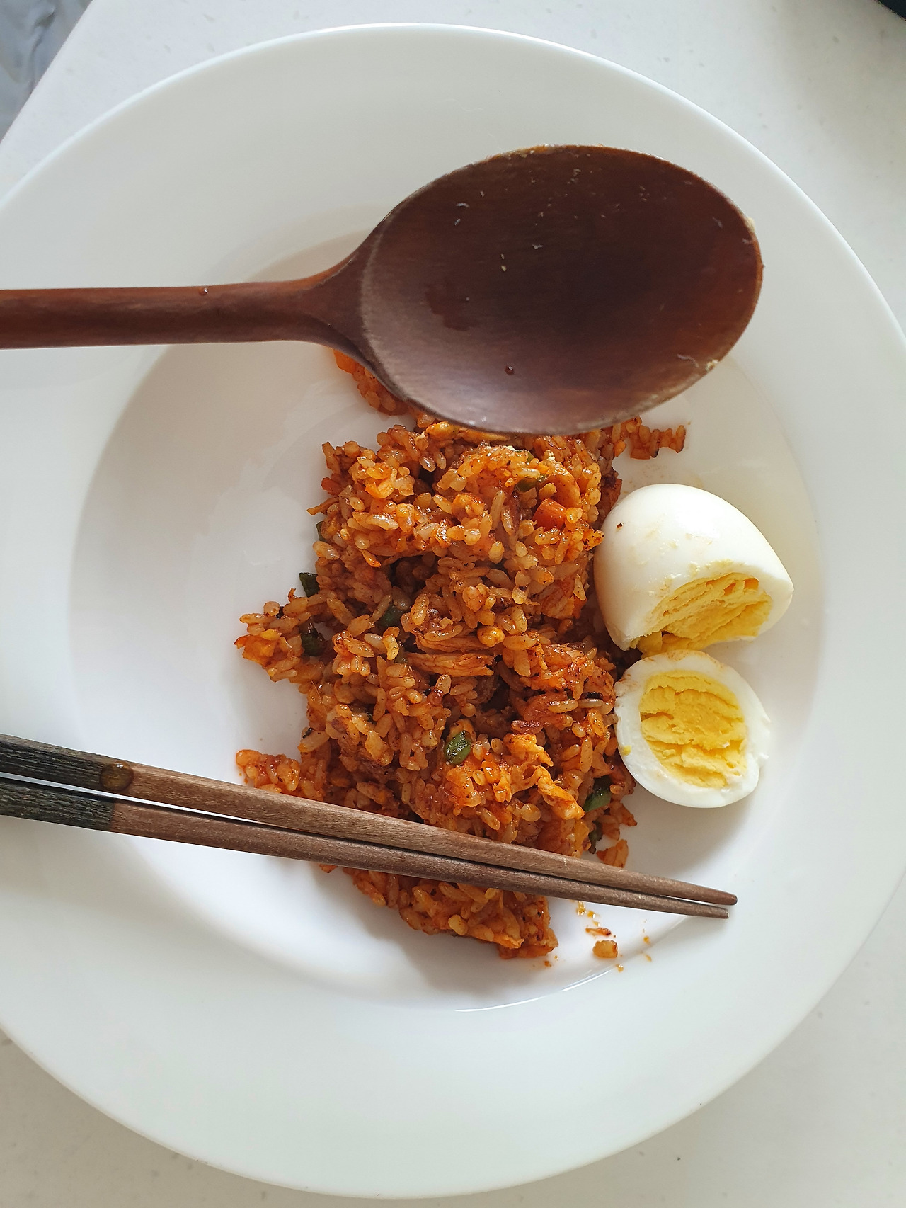 대신 아침은 가볍게 계란에 샐러드. 빡센 유산소와 복근, 스쿼트 챌린지까지 마쳤다. 이에 대한 보상처럼 바로 후라이팬에 기름을 두르고 치밥을 볶았다. 그 맛은 정말 너무 자극적이고 맛있었다. 다이어트식이 맞는지, 칼로리가 맞는지 몇 번을 확인했다. 계란도 하나 야무지게 마지막 한 숟갈까지 먹으니 오랜만에 포만감이 밀려왔다.