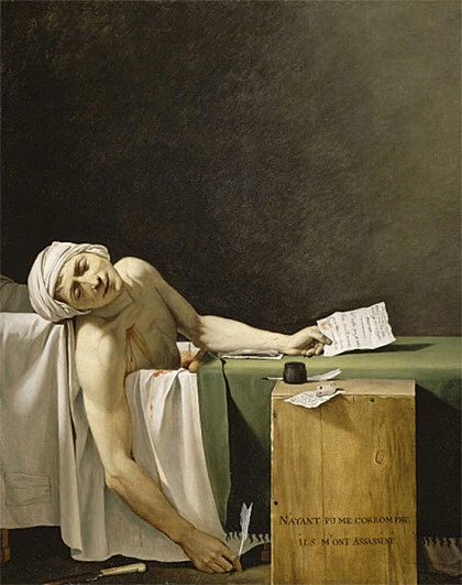 마라의 시신을 처음 발견한 청소부는 그의 만족한 표정에 한 번 놀랐다. 그리고 한눈에 보기에도 고급스러워 보이는 깃펜과 양피지를 놓치지 않은 양손에 또 한 번 놀랐다. 부드러운 녹색 천으로 하반신을 가리고, 새하얀 시트엔 진홍빛 피 몇 방울만 떨어져 있을 뿐이었다. 스스로 목 아래를 단도로 찌르고 자신의 마지막 순간을 기다린 남자의 모습은 충격적이었지만 동시에 눈을 뗄 수 없게 만드는 매혹이 있었다. 사실 이 극적인 장면은 철저히 연출된 것이었다.