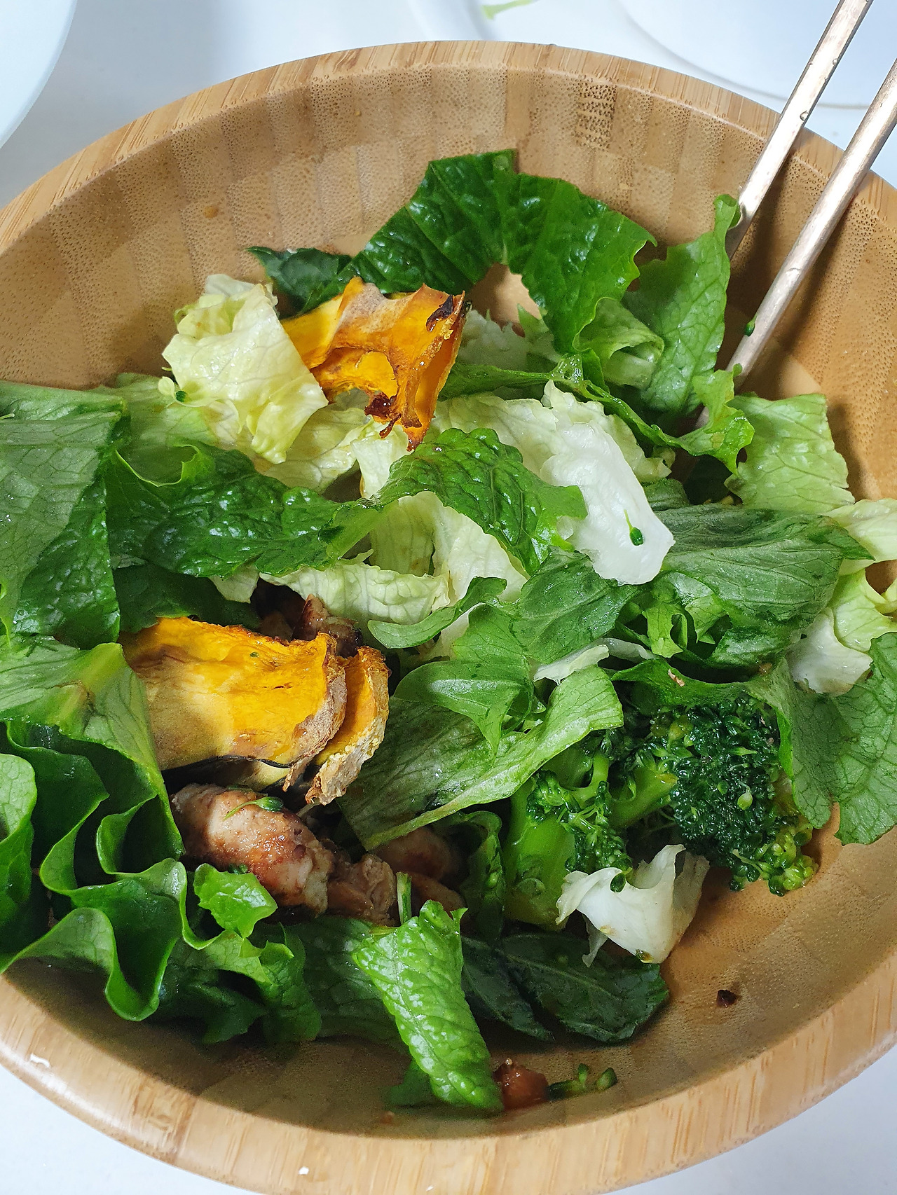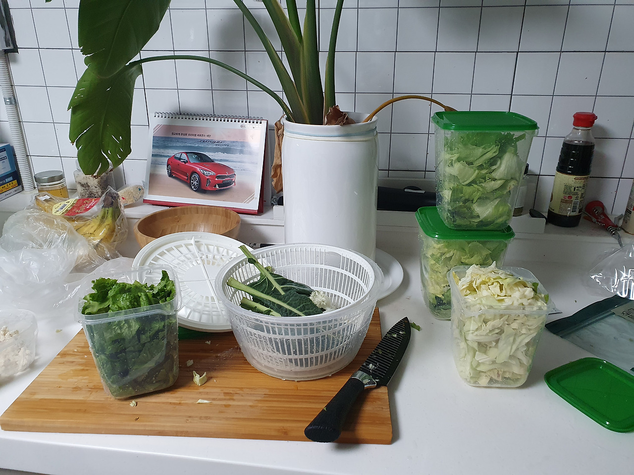 양배추를 썰고, 양상추를 씻고, 단호박을 굽고, 브로콜리를 삶는다. 닭안심은 녹여서 마늘과 함께 익히고, 양배추에 계란을 섞고 후추를 부어 후라이팬에 굽는다. 어디부터 시작해야 하는지 몰라서 모든 걸 일단 시작한 뒤에 순서대로 뒤처리를 했다. 냉장고 가득 샐러드 통이 쌓이고 각종 재료들을 밀폐용기에 담아 정리했다.