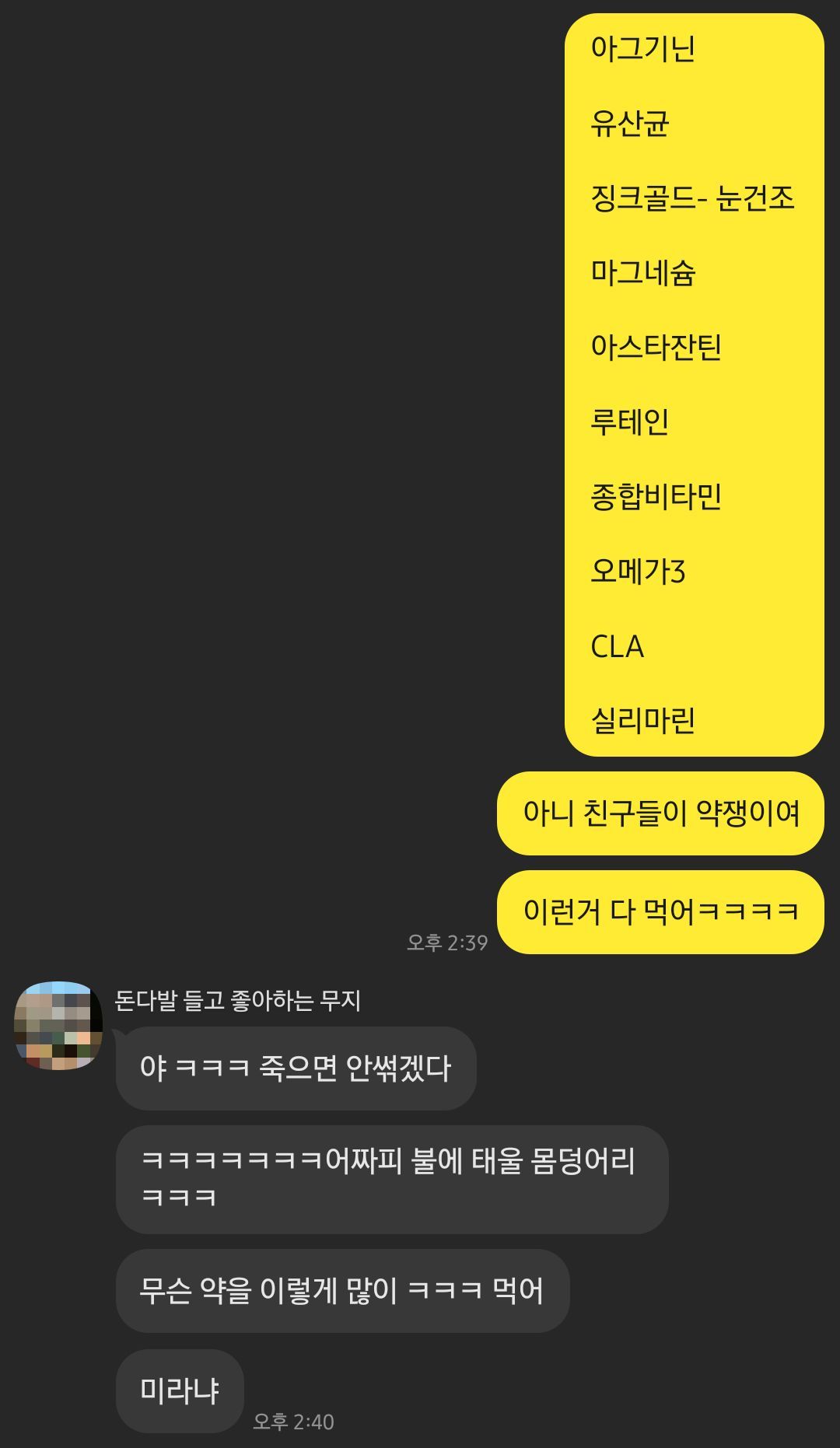 나만 빼고 이미 다들 약쟁이었다. 모아둔 리스트를 읽다보니 그걸 다 먹으면 아마 죽어서도 안 썩을 것 같았다. 20대 후반 들어서면서부터 일찍이 영양제 챙겨먹는 친구들이 꽤 된다는 건 알고 있었지만 이정도 일 줄이야. 눈 건조, 피부 노화, 근육 영양제까지 가지각색 저마다 추천하는 제품도 다양했다.
