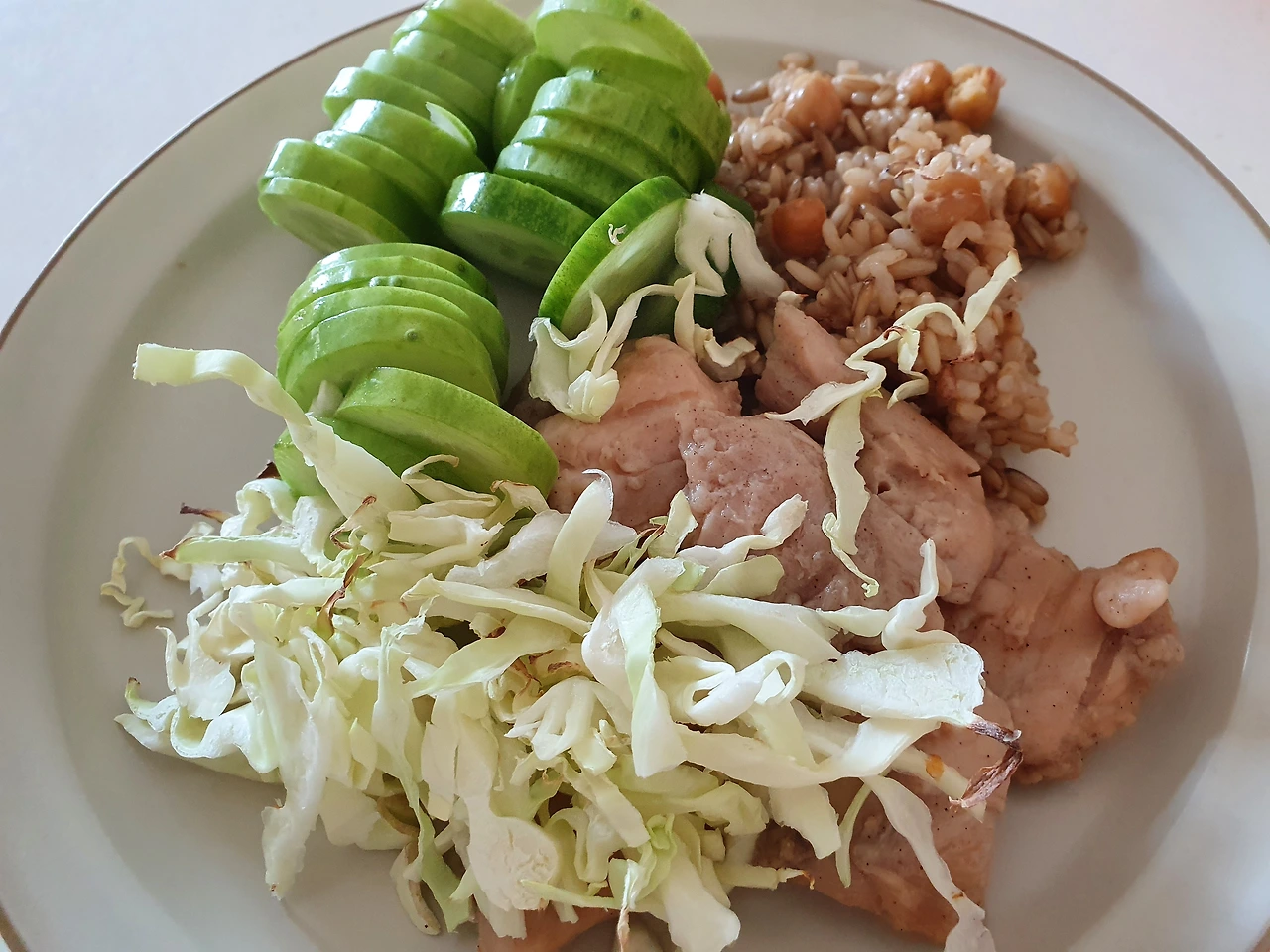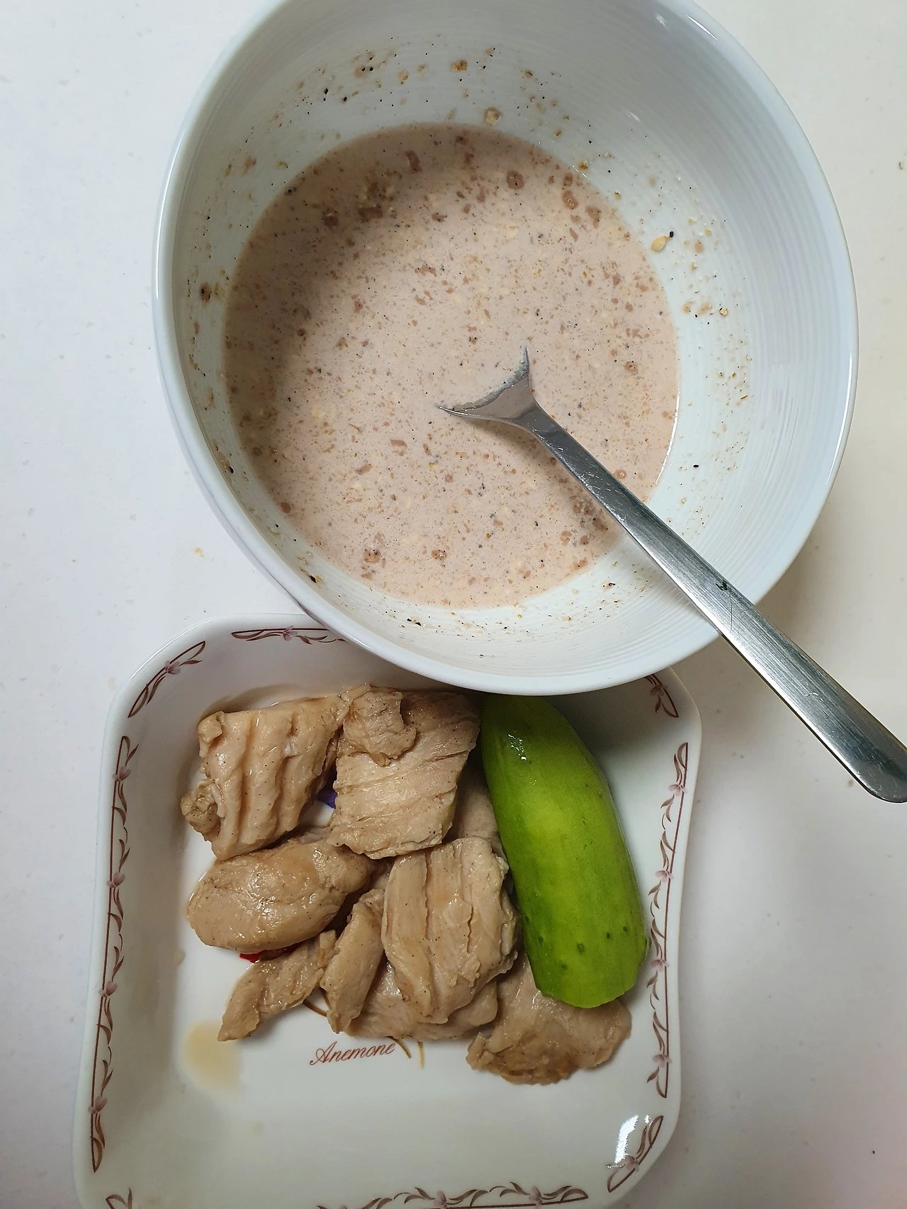 밤샘 철야 당직을 하고 새벽에 기어 들어와 아침을 먹었다. 밤을 새면서도 과자나 초콜릿 대신 고구마 하나에 찐 계란 하나로 허기를 달랬다. 못 잔 잠을 몰아 자느라 오늘은 하루 종일 헬스장 외에는 침대와 식탁을 오갔다. 양배추를 썰어 전을 만들고, 신선한 오이를 통으로 잘라 먹고, 오트밀에 우유를 자작하게 부어 단백질 파우더를 넣어 먹었다. 자극적인 음식은 없지만 충분히 맛있었다. 내가 계획했던 시간에 내가 차린 한 끼를 먹으