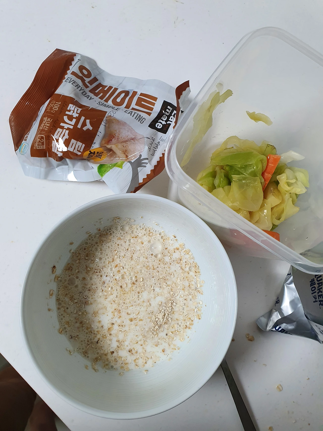 운동 후에 단백질을 적절히 채워준 게 효과를 봤던 것 같다. 아침부터 닭가슴살이나 계란으로 단백질을 든든히 채워주고, 중간 중간 단백질 바나 간식으로 계란을 먹어주었다. 운동 중에는 물 대신 프로틴 워터를 마셔주었다. 운동이 끝난 뒤에도 단백질 파우더를 탄 오트밀이나 닭가슴살을 한 팩씩 먹어주었다.