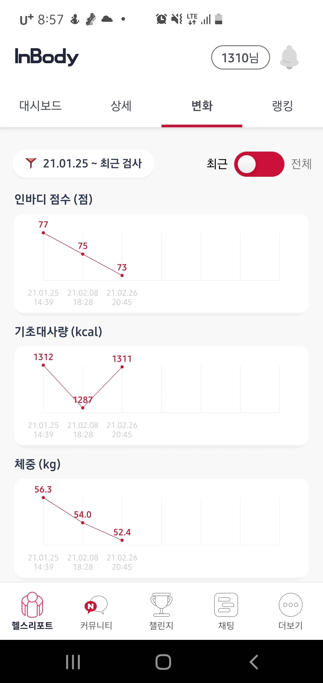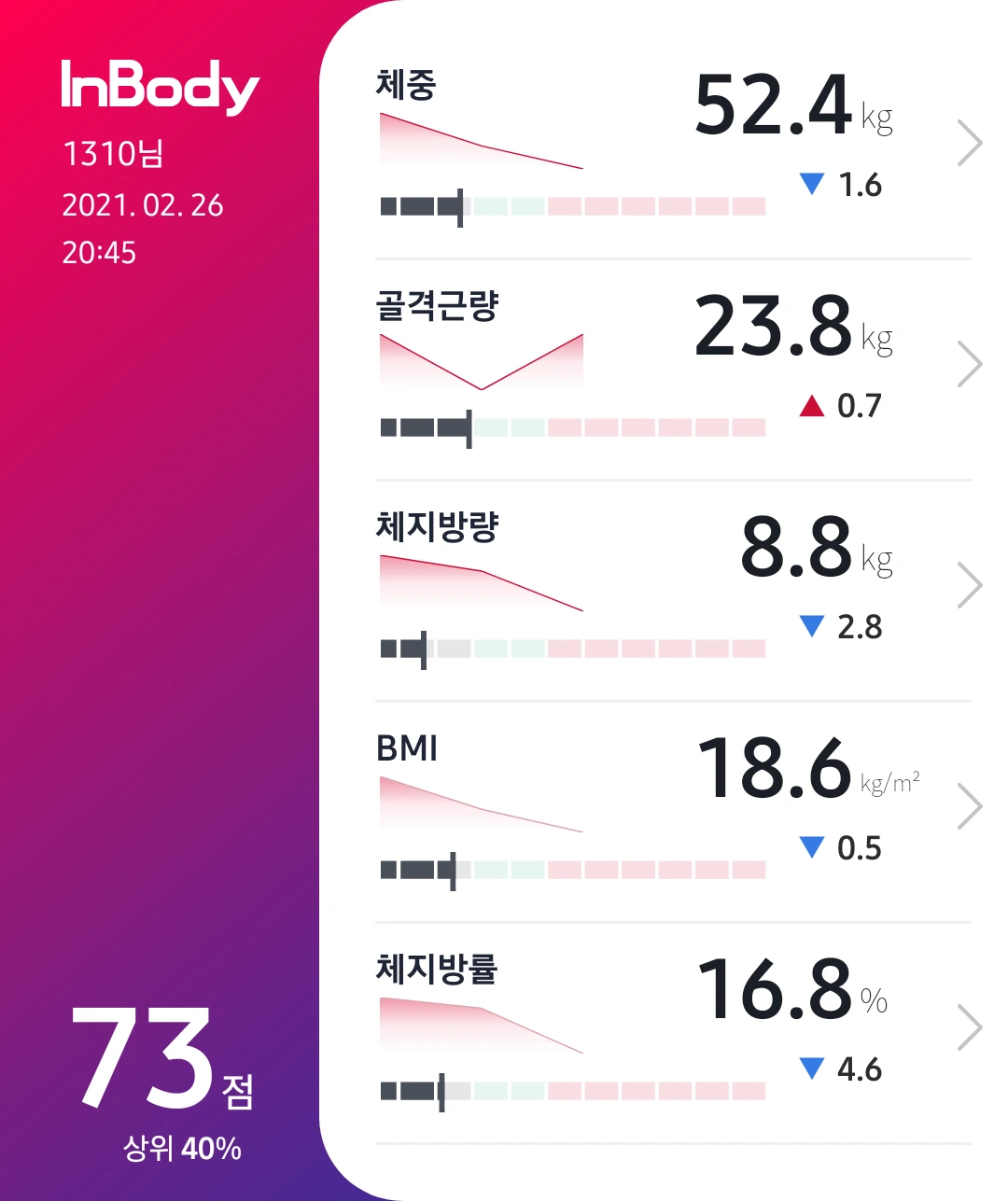 체지방량 8.8kg, 체지방률 16.8%