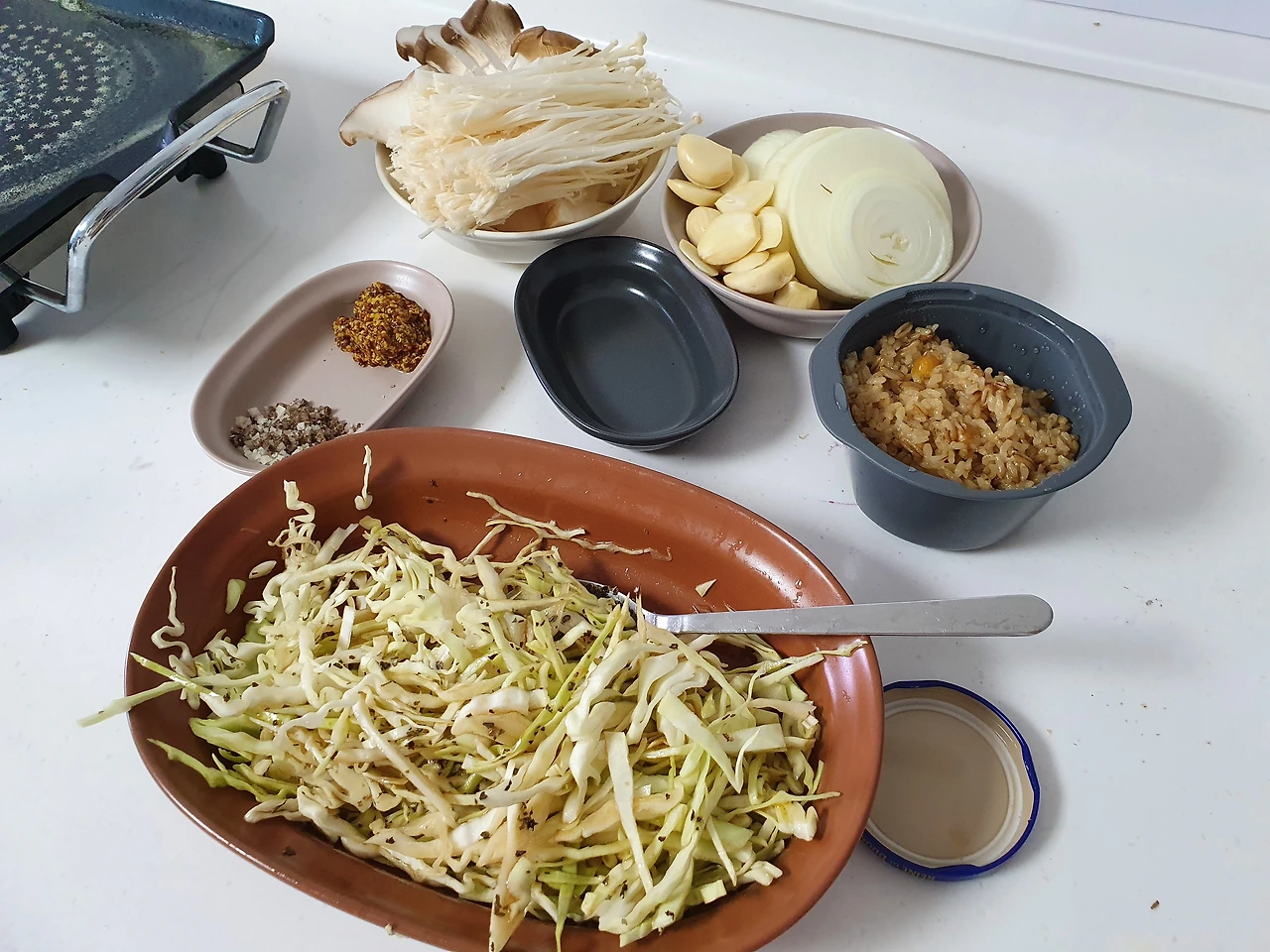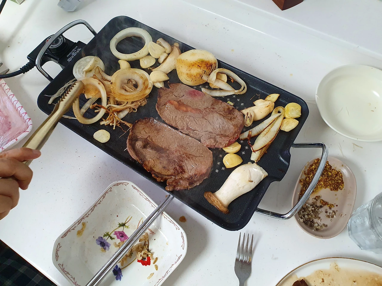 나보다 훨씬 음식을 잘하는 남편은 고기도 잘 구었다. 버터를 바른 팬에 적당히 익힌 소고기는 최고였다. 아무래도 채끝등심이 두툼한 식감에 너무 맛있었다. 일주일에 한번은 이렇게 소고기로 플렉스 하자. 그런 여유로운 일상을 만들어봐야겠다 진지하게 생각해볼 맛이었다. 버섯과 양파, 마늘도 잔뜩 굽고 냉동실에 얼려둔 현미밥도 꺼냈다. 스테이크 소스 없이 소금만 찍어 먹어도 감칠맛이 일품이었다.