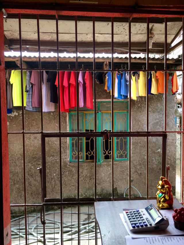 시멘트 담벼락, 페인트 칠한 대문, 물이 고인 골목 바닥.