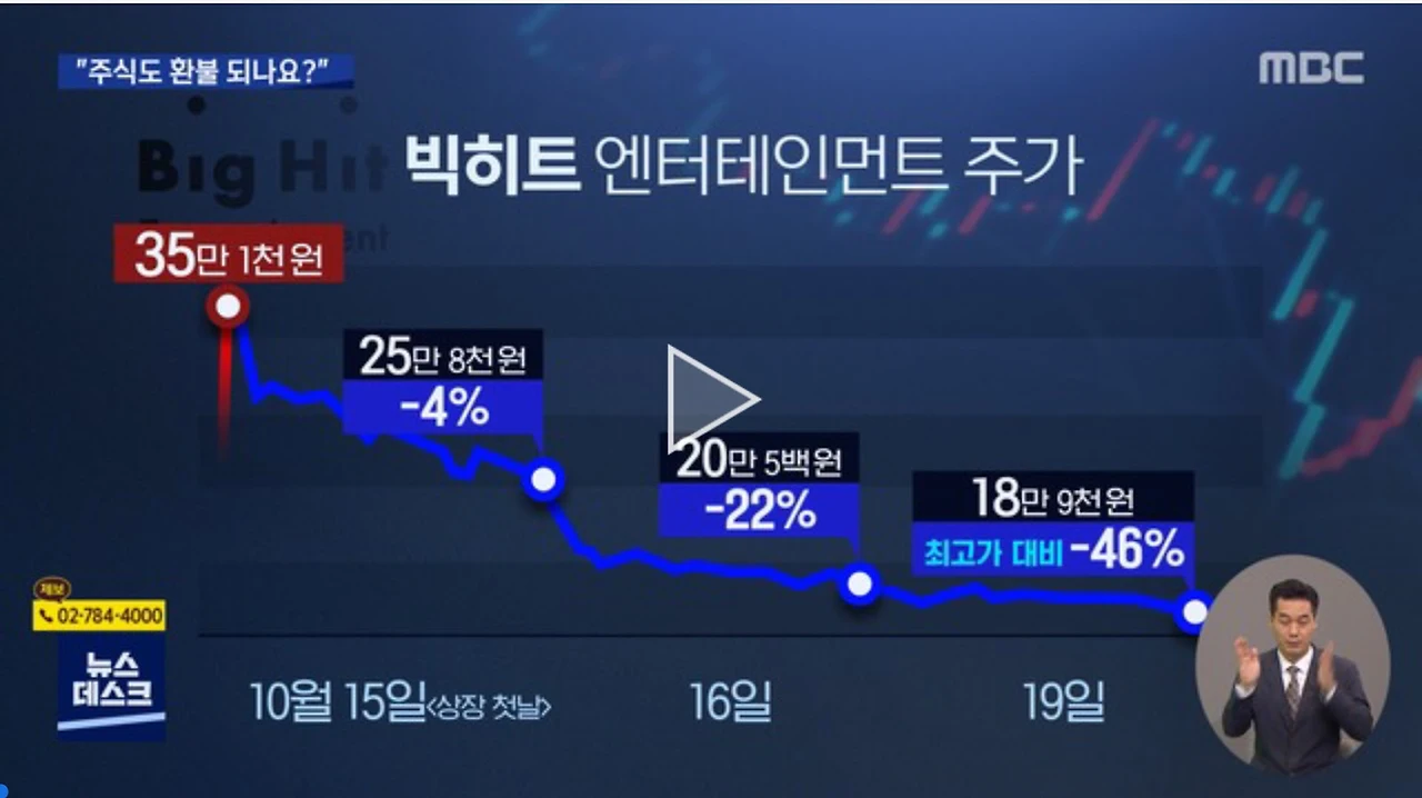 SK바이오팜, 카카오게임즈와는 달리 빅히트는 상장 후 5거래일 연속 하락세를 보였습니다. 관련하여 공모가격이 어떻게 결정됐냐는 내용의 청와대 국민청원이 등장하고, 결혼자금인데 환불이 안 되냐는 문의 글이 인터넷상에 이슈가 되었습니다.