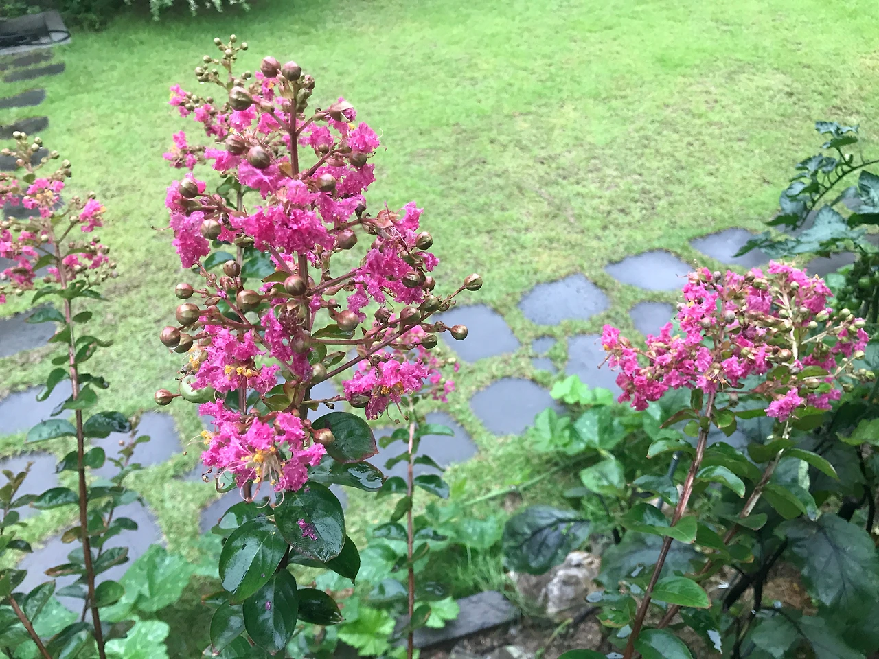 장맛비 속에서도 꽃들의 향연이 시작되었지만, 기나긴 장마가 시골집을 울적하게 만들어 장맛비에 정신을 쏟는 사이, 드디어 고대하던 목백일홍도 슬며시 꽃을 피운 것이 아닌가? 그렇게 아내가 기다리던 목백일홍이 분홍빛 꽃을 피운 것이다. 기나긴 장맛비를 맞으며 꽃이 피어서 그런지 조금은 싱싱한 맛이 없었지만, 여러 줄기에서 분홍 빛으로 꽃을 피워 나무를 붉게 물들였다. 한 여름 장마철에 꽃을 볼 수 있어 다행이다 싶지만 이왕 피었으니 적어도 100일은 피워 화려하게 빛났으면 좋겠다.