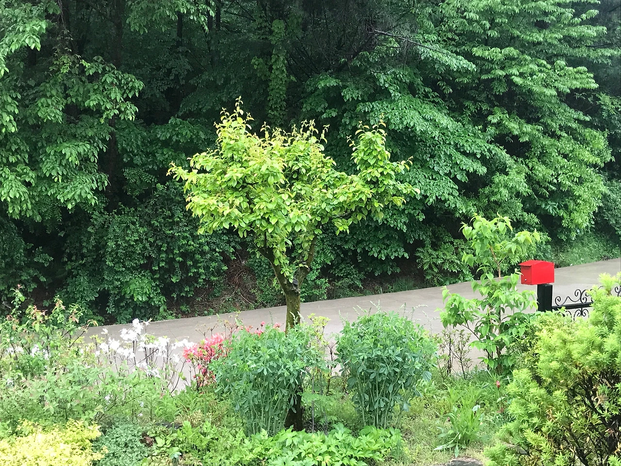 나의 앞산엔, 하늘 바로 아래 낙엽송이 자리해 푸름 속을 오고 간다. 긴 숲을 이루고 있는 낙엽송 아래로 꺽다리 참나무가 자리를 챙겼다. 널찍한 잎이 유난히도 푸른 참나무이다. 연한 녹색에 검푸름 옷을 가득 입었다. 넉넉한 참나무가 까칠한 소나무를 가득 품었고, 아래쪽으로 도랑을 건너 푸른 잔디가 자란 앞마당이 포진해 있다. 창문을 열면 언제나 마주할 수 있는 환상의 앞 산언덕이다. 봄이면 초록이 삐죽이 올라오고, 여름이면 검푸름이 물을 들인다. 검푸름이 지쳐 넘치면 알록달록한 낙엽이 온 산에 불을 지른다. 정열의 불이 사그라들면 하얀 눈이 내리며 온 산을 덮어 준다. 하얀 눈이 덮인 포근한 겨울이 지나면서 봄을 기다리게 한다. 계절 따라 많은 이야기를 전해주는 신기한 자연 속의 나의 앞동산이다.