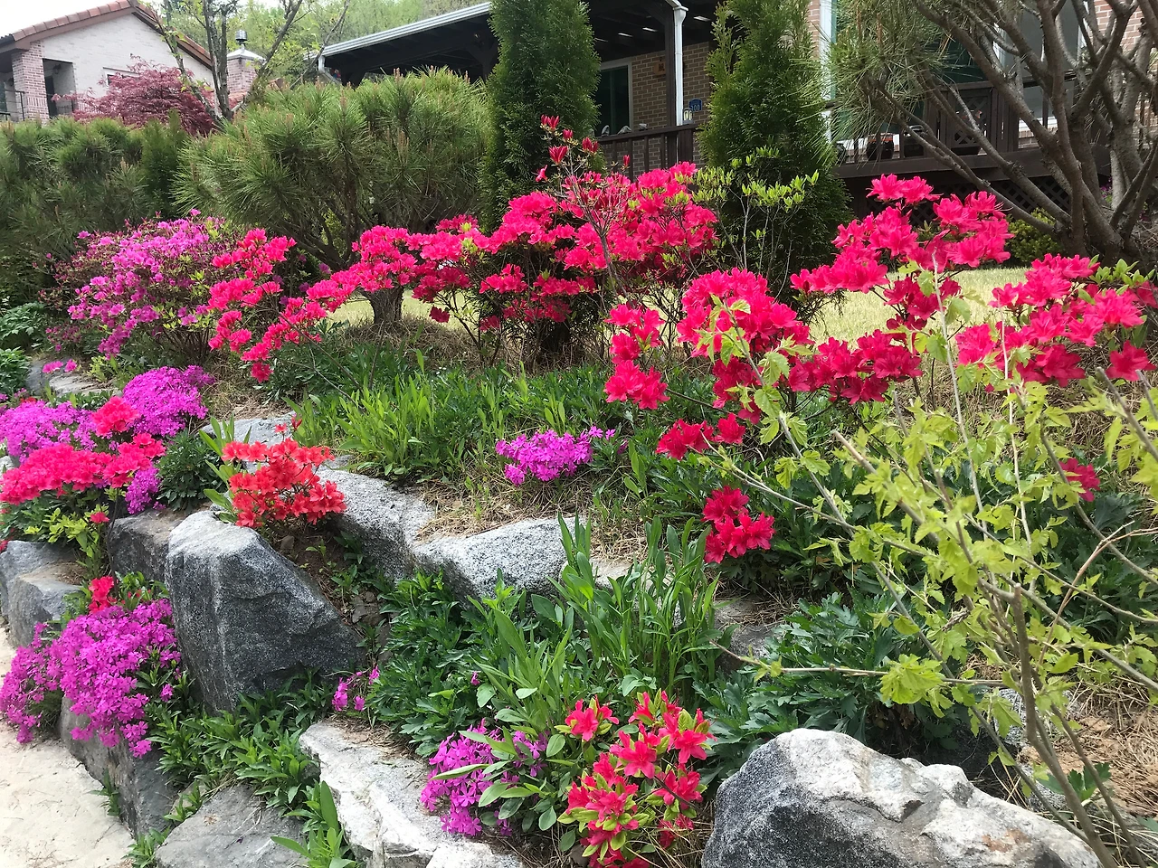 봄에 만난 잔디밭 끝, 화단