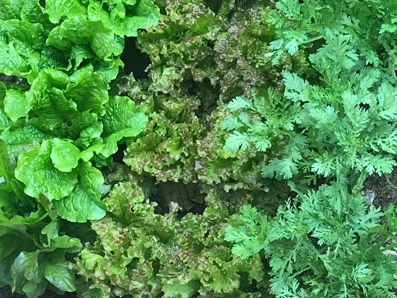 큰 텃밭은 세평 남짓하고, 두 평 남짓한 작은 텃밭이 두 개 더 있다. 큰 텃밭에는 단골손님인 쌈채소가 주를 이룬다. 상추를 종류별로 골고루 20여 포기를 심는다. 거기에 쌉쌀한 쑥갓 십여 포기가 빠질 수 없고, 건강에 좋다는 케일 십여 포기도 단골손님이다. 이만하면 쌈채소는 충분하고, 남는 것은 친지들에게도 넉넉히 줄 수 있다. 여기에 음식에 반드시 필요한 파가 심어져 있고, 아욱과 시금치도 빠질 수 없는 밭이니 마치 꽃을 기르듯이 잔잔하게 심어 놓는다. 푸릇한 상추가 키를 불리면 쑥갓이 따라서 크고, 여기에 질 수 없다는 듯이 케일이 키를 불린다. 파는 언제나 넉넉하게 자라며, 아욱과 시금치도 잘 자라서 자기 몫을 톡톡히 하고 있다. 대략 2평 남짓한 작은 밭 두 개도 넉넉하게 자기 몫을 하고 있다.