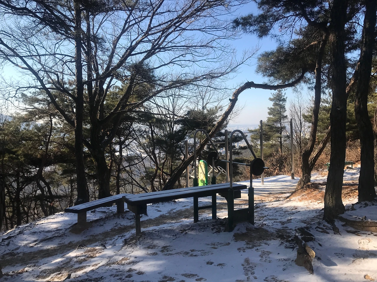 아직은 쓸만하다고 생각하는 몸을 이끌고 정상에 도착했다. 추운 겨울이지만 시원함을 느끼게 하는 바람이다. 겉 옷을 풀어헤치자 마음까지 상쾌한 겨울바람이다. 살기 좋은 세상임을 알려주는 운동 기구들, 지자체에서 설치해 놓은 운동 기구들이다. 어떻게 이 무거운 것을 들고 왔을까? 주변에 이동식 화장실도 구비되어 있다. 역시 어떻게 이곳까지 이동시켜 왔을까? 삶에는 다양함이 존재한다는 생각을 갖게 한다. 누군가는 힘든 노동이 있었기에 많은 사람들이 누리고 있다. 먹고 살기 힘겨웠던 시절 하고는 전혀 다른 세상이다. 산 꼭대기에 운동기구가 설치되고, 정상까지 쉽게 올 수 있도록 야자매트를 깔아 놓았다.