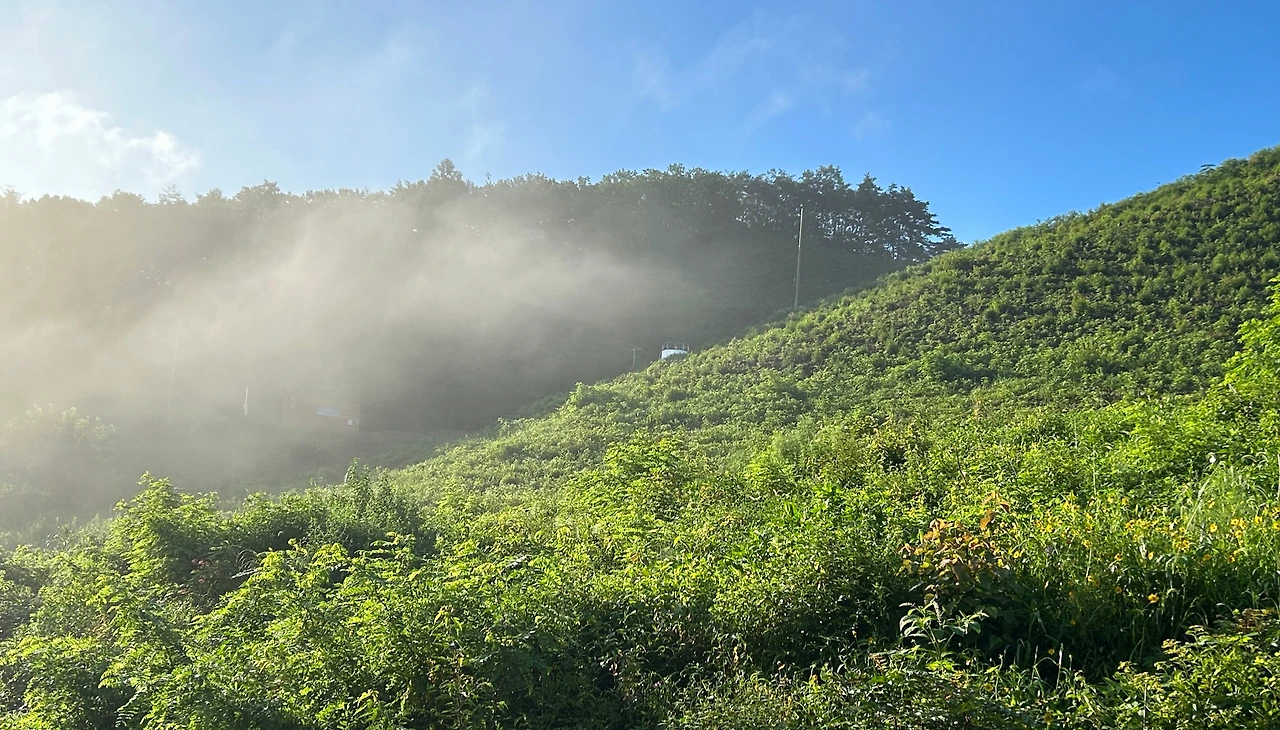 얼른 일어나 창문을 열자 물소리가 세차가 들려온다. 도랑물은 어느새 몸집이 거세졌다. 좋기도 하고, 두렵기도 한 가을비다. 가을비는 들판에 필요 없고, 곡식을 익혀야 하는 따가운 햇살이다. 앞산엔 하얀 안개가 내려와 여기가 골짜기임을 새삼스레 알려주는 그림이다. 바람 따라 오가는 물안개는 빗줄기와 함께 넘실거림에 넋을 놓았다. 바람 따라 산을 넘고 앞산 모습을 바꾸어 놓는다. 갑자기 비가 그치고 햇살이 나타났다. 물안개가 햇살에 쫓기듯 산을 넘는다.