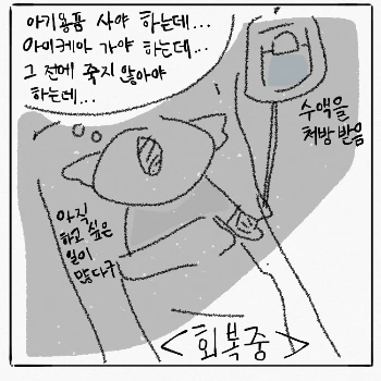 나는 어렵게 의사와 마주하고 있었다. 의사는 난색 하며 지금은 상태가 심한 것 같으니 입덧 억제제를 처방해주겠다고 하고 수액을 권했다. 나는 수액을 맞고 최대한 많은 양의 입덧 억제제를 처방받았다.
