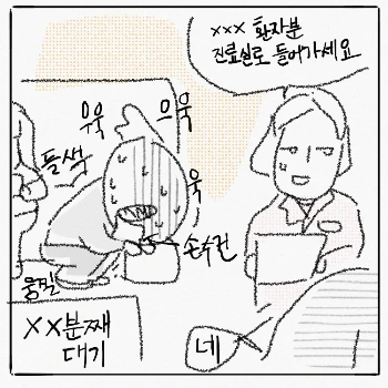 빨리 진료를 받고 집에 돌아가고 싶은 마음이 굴뚝같았다. 그 마음이 물질로 형상화되어 목구멍을 탈출하려고 움찔거렸고, 화장실을 몇 차례 들락거리며 무에서 유를 창조하는 연금술을 펼쳤다. 자리에 돌아올 때마다 간호사들의 표정은 점점 안 좋아졌다.