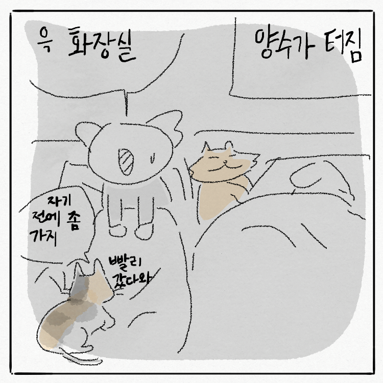 그런데 가진통에 아파하다 어떻게 잠들었는지도 모를 새벽에 기묘한 통증을 느끼고 자리에서 일어나 시계를 봤던 것이다. 시곗바늘은 새벽 1시를 가리켰다. 화장실에 갔다. 문이 열리고 둘째 고양이가 들어와 변기에 앉은 나를 확인하고 즐거워했다. 거실로 나오자 첫째 고양이가 이동하는 나를 따라와 길게 하품했다.