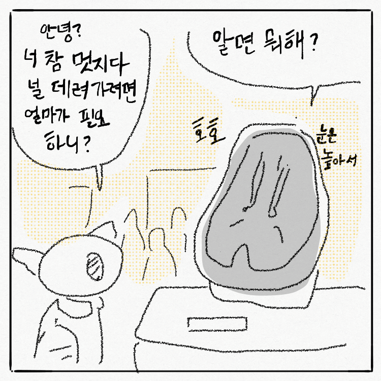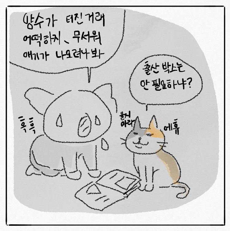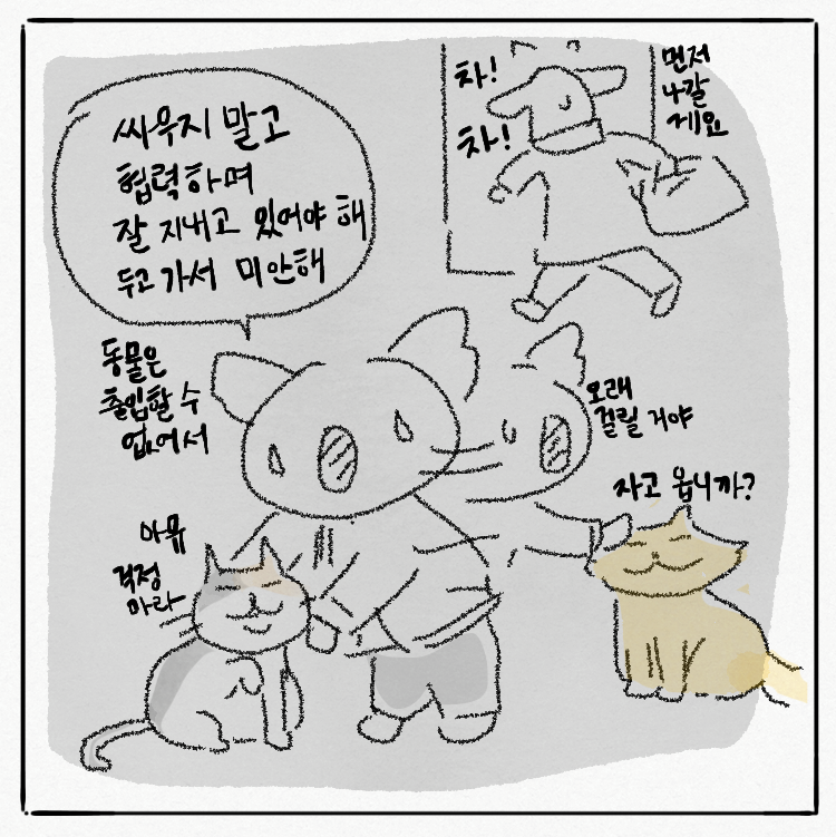 고양이들을 재차 확인하고 채비를 마쳤는데 차를 가져온다는 남편이 쉬이 오지 않았다.