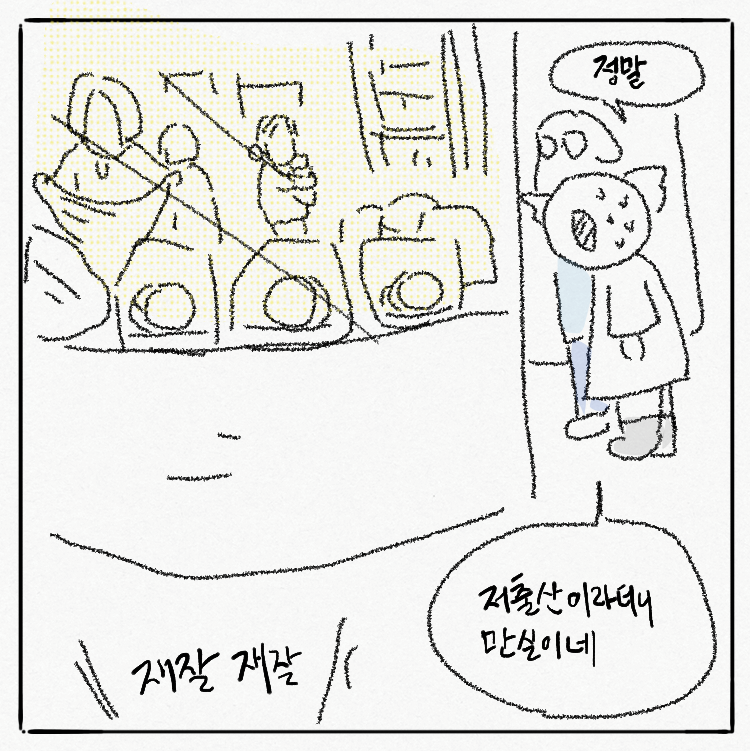 남편은 상당히 피곤한 몰골로 아침을 맞이 했다. 더는 나를 위로해줄 마음의 여유가 없을 텐데, 남편도 인내와 폭발 그 사이 어딘가, 폭발보다는 짜증에 가까운 지점에 머물며 다른 아기들을 둘러봤다. 비혼주의, 저출산, 고령화를 문제 삼는 세상이라는 게 구라 같다고, 우리는 맥없이 평했다.
