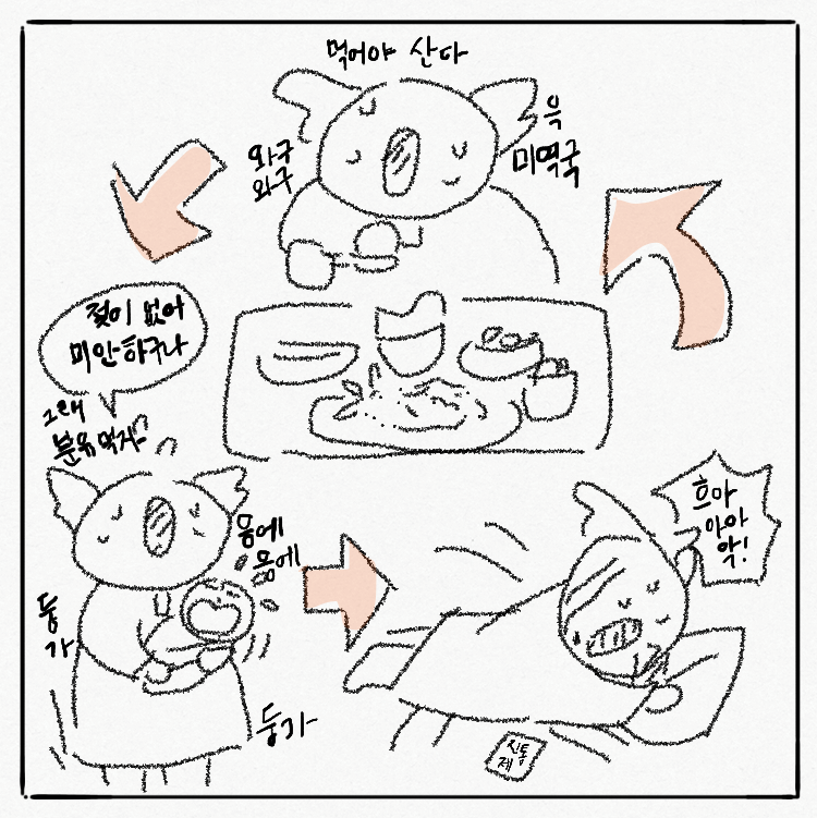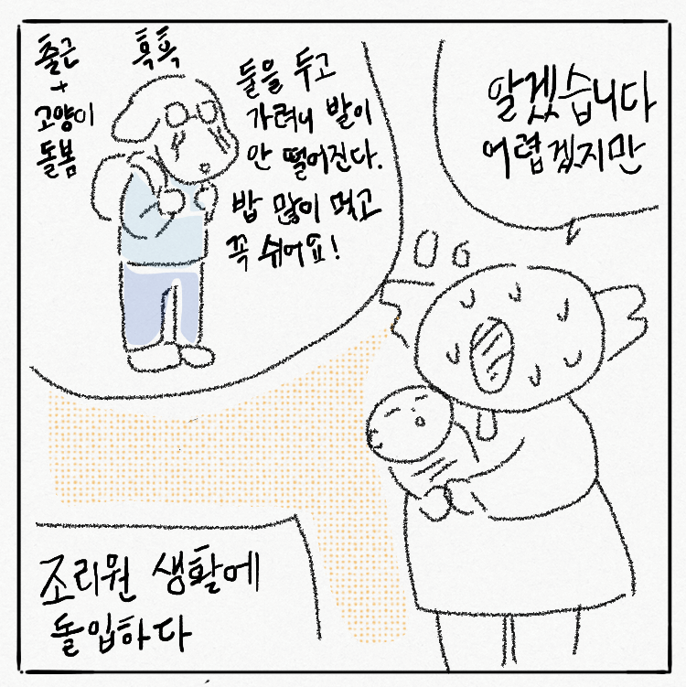 그 무렵에는 모유 수유를 포기하지 않으려는 일념으로 유방 마사지를 하고, 유축도 틈 나는 대로 했다. 밥은 말할 것도 없이 다 먹었다. 밥때가 되면 밥상을 문가에 두고 방문을 활짝 열어뒀다. 그런데 나로 말할 것 같으면 모두가 충분히 남기는 와중에 모조리 털어마시고 가장 아파했다. 조리원 직원들은 그런 나를 이상히 여겼음이 분명하다. 하지만 나의 고양이들을 걸고 맹세코 거짓 없이 아팠다. 종교에 귀의하고 싶었다. 정말로 영양섭취와는 별개로 건강이 회복되는 느낌이 없었기에 당사자인 나는 허탈했다.