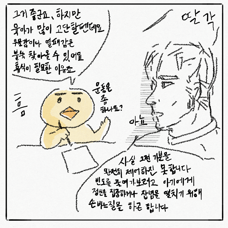 산후도우미 제도 도움을 받아 겸허히 힘겨운 나날을 보내던 시절이었다. 개월 수가 차면 새로운 과업에 주어지므로, 아기가 큰다고 마냥 편해지는 건 아니지만, 신생아를 돌보는 초짜 엄마는 그저 웁니다. 여기에 산후우울증은 덤이 아닌 메인 디시다.