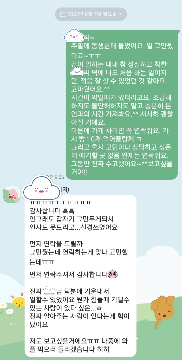 7월 31일인 어제까지만 해도 8월부터 가게 오픈시간이 변경되었으니 9시 30분이 아닌 10시까지 출근하면 된다는 카톡을 주고받으며 다음 주에 보자는 인사도 나눴었는데, 하루 만에 점장님의 퇴사 소식을 접하니 어안이 벙벙했다.