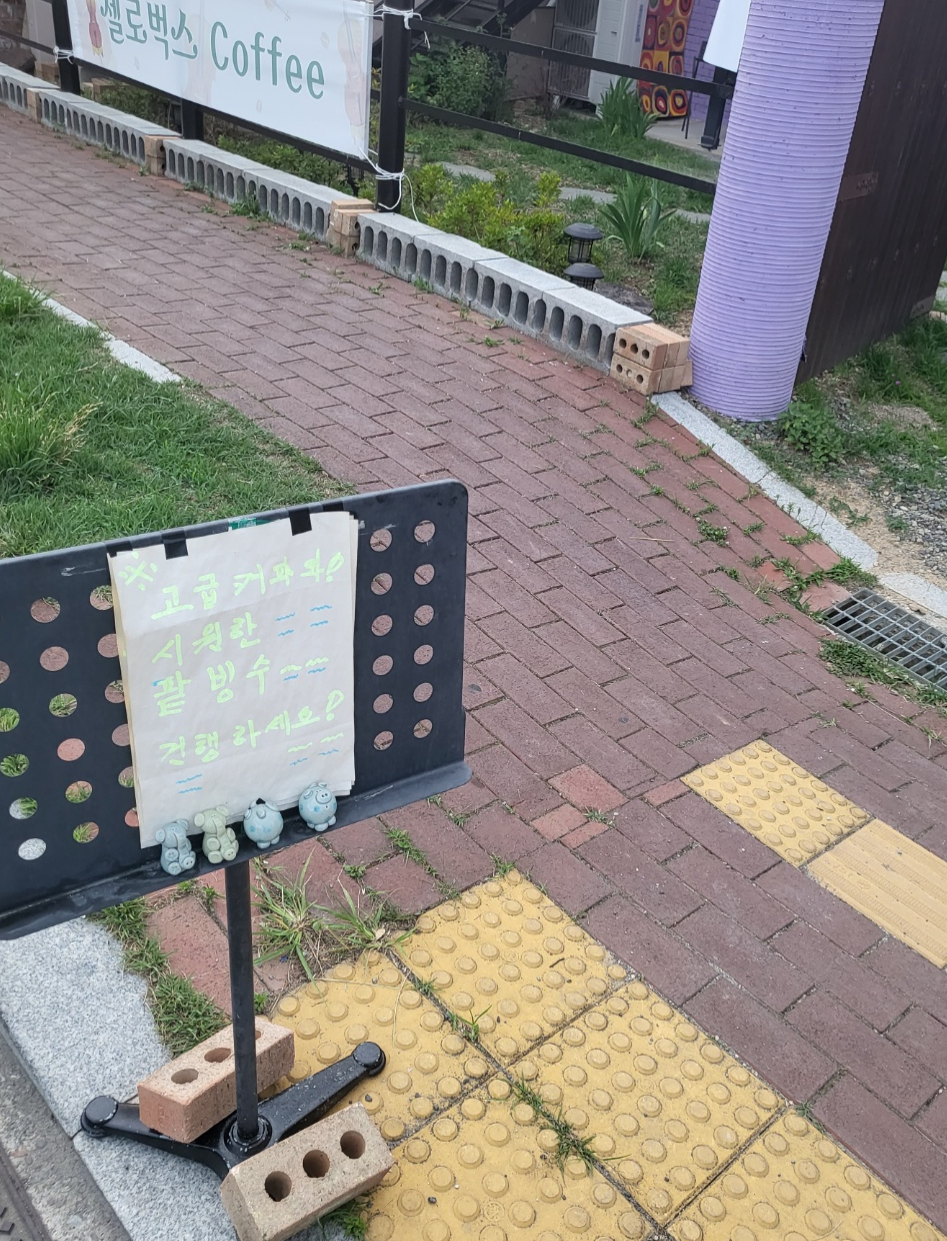 판매하고 있는 고급 커피와 시원한 팥빙수의 언급은 거들뿐, 그저 가수 임영웅 씨의 인사 멘트처럼 모두가 '건행'하기를 바라는 것이 주된 목적인 듯하다. 그냥 지나치던 사람도 이 글을 읽는 동시에 가수 임영웅 씨를 떠오르게 하는 알림판 역할을 하고 있었다.