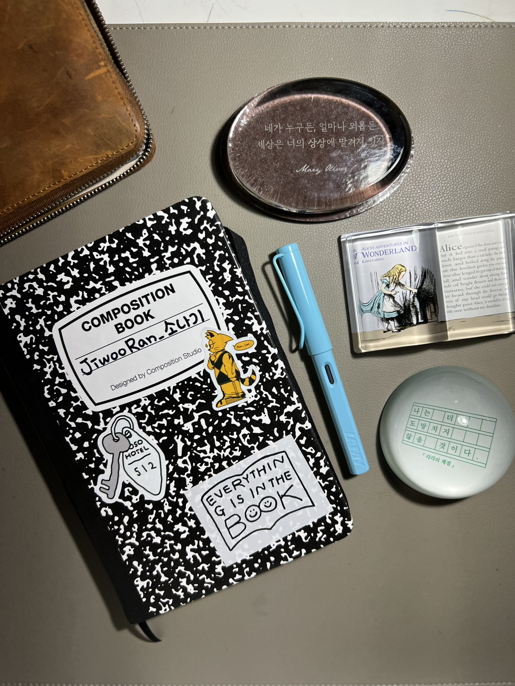 문진으로 노트 한쪽을 눌러놓고 글을 쓴다. 지난주부터 컴포지션 스튜디오와 라미 만년필 브랜드가 협업하여 제품을 제공받고 4주 동안 글을 쓰며 제품을 경험하는 라이팅 클럽 멤버에 선정되었다. 이틀에 한 편씩 컴포지션 스튜디오 노트에 라미 만년필로 쓴 글을 인스타그램에 업로드한다. 같은 날 을유문화사에서 [에밀리 디킨슨 시 선집] 서평단에 뽑혔다는 연락을 받았다. 지난 4월부턴 장편소설 워크숍을 신청해 소설을 쓰기 시작했다. 합평 날짜가 정해지고 그날까지 정해진 분량을 채우기 위해 매일 200자 원고지 10에서 20매 분량의 장편소설을 꾸준히 쓰려고 노력한다.