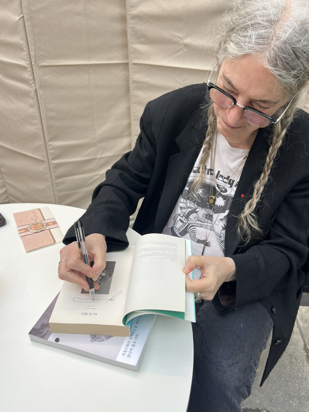 새하얀 머리칼을 양갈래로 땋아 늘어뜨린 그녀는 책에서 나온 대로(인스타그램에서도 자주 본 대로) 일렉트릭 레이디 스튜디오 티셔츠를 입고 있다. 여행을 떠날 때마다 항상 작성하는 여행 목록에 빠지지 않는 옷을 입은 그녀가 한국에, 내 앞에 앉아 있다. 자그마한 체구의 그녀 주변은 다른 곳보다 밝다. 흰 머리칼과 머리칼만큼이나 밝은 미소와 그녀만의 아우라가 공간을 조용히 채운다. 내 앞에서 나와 같은 책을 가지고 와 사인을 받은 사람이 감격에 겨워 거의 쓰러질 것 같다. 그녀는 웃으며 그에게 인사한다. 그녀가 내 책의 표지를 열고 사인을 한다. 책에서 그녀가 성소로 향하듯 습관처럼 가던 카페 이노가 문을 닫던 날 마지막으로 찍은 사진 위에 사인을 한다. 그녀가 책 표지에 실린 자신의 사진을 쓰다듬는다. 나는 아무 말도 하지 못한다. 수줍게 손을 내민다. 그녀는 기꺼이 두 손으로 나의 손을 잡아준다. 그녀의 손은 부드럽다. 이것이 네 꿈의 질감이다, 그녀의 손을 통해 세계가 말을 건다. 가끔은 나도 너의 꿈을 훔쳐볼 때가 있단다. 나는 그녀에게 인사한다. 감사합니다.