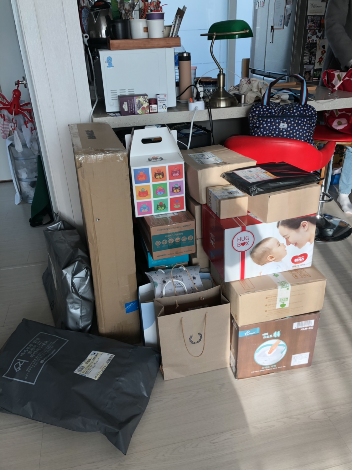 조리원 퇴소를 이틀 앞두고 청소 및 주문한 물건 정리를 위해 외출증을 썼다. 2주 만에 들어선 우리의 집은 2주 치의 택배 상자를 잔뜩 삼킨 채 소화불량을 호소하며 우리를 맞이했다. 가위와 칼로 상자를 하나씩 뜯고 안에 물건을 확인한 뒤 송장을 떼어내고 상자를 분리수거하는 과정이 공장처럼 반복되었다. 모든 상자를 다 뜯어 집 안 이곳저곳에 적절히 배치하고 전원을 연결해 버튼을 눌러보고 세제로 닦고 소독하고 분리수거까지 마치자 해가 지고 밤이 찾아왔다.