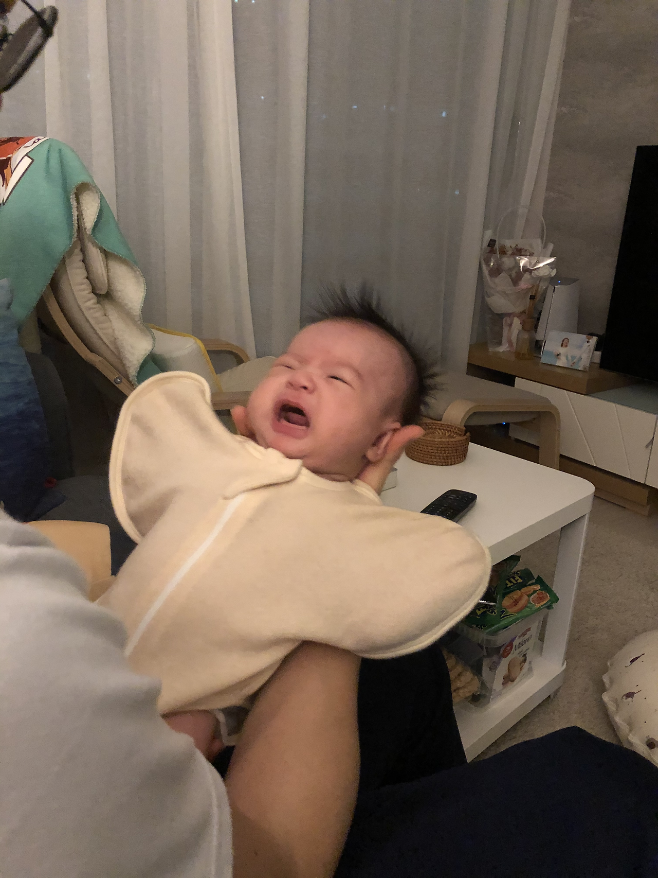 5. 아직 시력이 발달되지 않아 잘 보이지 않기 때문이기도 하다. 대신 소리에 민감하다. 뱃속에서 들었을 소리와 비슷한 백색 소음-비닐 부스럭거리는 소리, 헤어드라이기 소리, 물소리, 쉬~-을 들려주면 울음을 그치고 안정을 되찾는다.