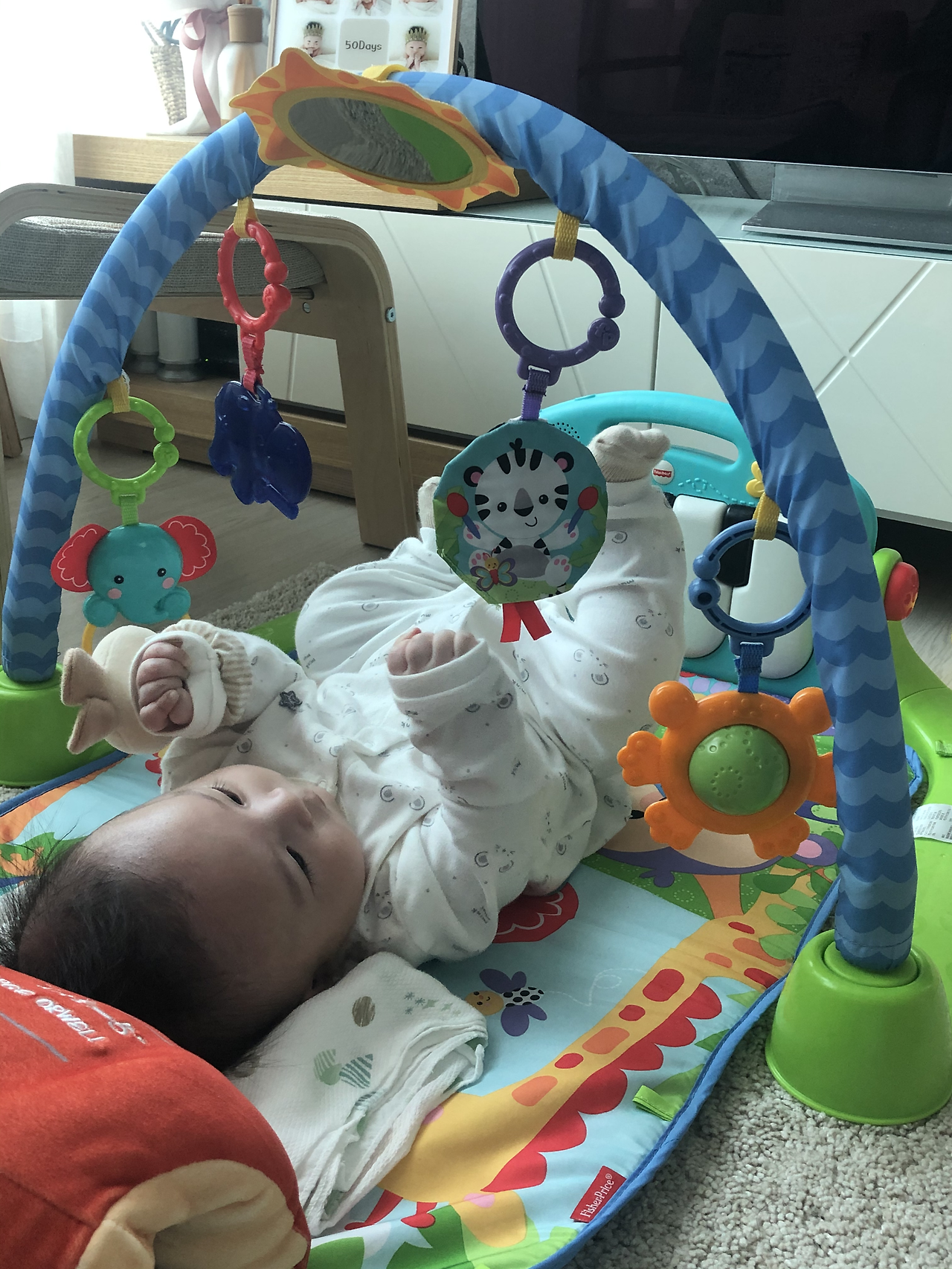 육아는 체력이다, 수많은 육아 선배들에게 귀가 닳도록 들은 말이다. 아이들의 체력이란 무한동력 같아서 지치지도 않고 달리고 뛰고 끝없이 놀자고 조른다(고 한다). 조금씩 낮잠 시간이 짧아지는 아이를 보며 처음으로 체력의 소모가 아닌 생산을 목격했다. 5분 모빌 보면 놀다 지쳐 잠들던 아이가 이젠 10분 넘게 아기 체육관에서 멈추지 않고 팔다리를 놀린다. 손을 뻗어 눈 앞에 아른거리는 물체를 탐색하려 든다. 제 팔과 다리를 쓰는 연습을 하면서 슬슬 뒤집기 준비를 한다.