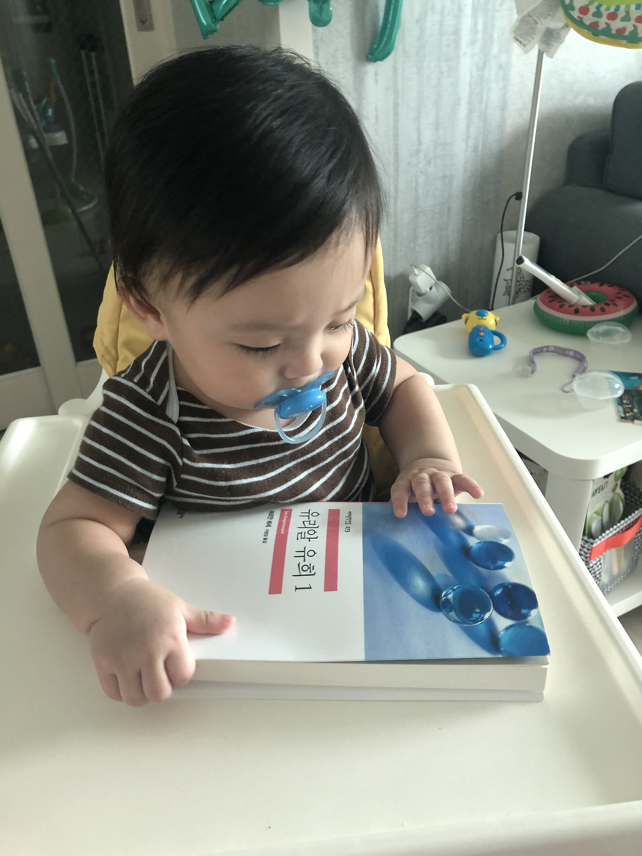 이젠 스스로 앉기까지 가능한 8개월 아기와 하루 종일 집에서 함께 시간을 보낸다. 오전 7시 반 분유수유, 트림을 시키고 아기의자에 앉혀 치발기 쥐어주고 내 아침식사, 점퍼루를 타거나 에듀테이블을 두드리거나 놀이매트 위에서 기어 다니며 놀기, 놀다가 매트 밖으로 나와 내 발 만지작대기, 아침 응가(아기), 1차 낮잠, 12시쯤 이유식 및 분유 보충, 쌀떡뻥 하나 쥐어주고 내 점심식사, 점퍼루를 타거나...(반복)... 2차 낮잠 후 4시쯤 2차 이유식을 먹고 분유보충하고 과일 갈아서 먹이거나 과일퓨레를 주거나 해서 먹고 놀고 싸고 자고 목욕하고 자고...