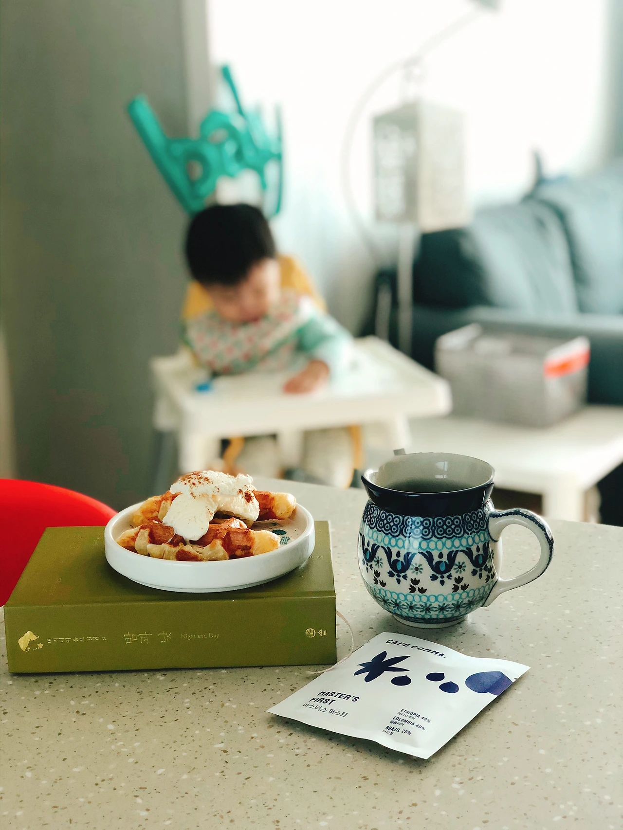 아이가 깨면 한 시간 단위로 움직인다. 세 시간 텀의 이유식 먹이기, 그 사이 간식 시간, 지난주부터 직접 만들기 시작한 유아식 제조, 방학에 들어간 남편과 나의 세 끼 식사, 청소, 기저귀 체크, 놀이 시간이 보이지 않는 시간표에 맞추어 돌아간다. 오후 세 시 커피 타임이 가장 중요하다. 아이에게 멸균우유가 든 병을 쥐어 주고 우리가 마실 커피콩을 갈아 정성껏 커피를 내린다. 조용히 우유와 커피를 마시며 보내는 한 시간을 중심으로 하루의 시간이 평가되고 재배치된다. 오늘은 잘 보냈군, 혹은 오늘은 유독 힘든 하루였어. 힘든 하루였으면 나머지 시간은 괜찮으리라 위로하고, 나쁘지 않은 오전이었다면 이어질 시간도 이 기세를 이어가자며 힘을 낸다.